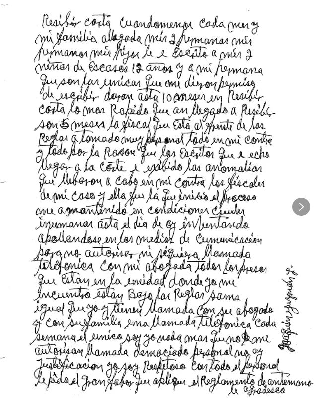 Detalle de una de las cartas que El Chapo ha escrito a mano desde la prisión de máxima seguridad de Florence (Colorado).