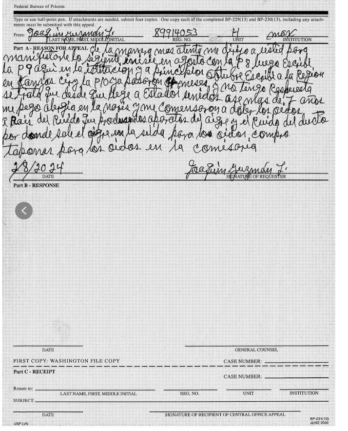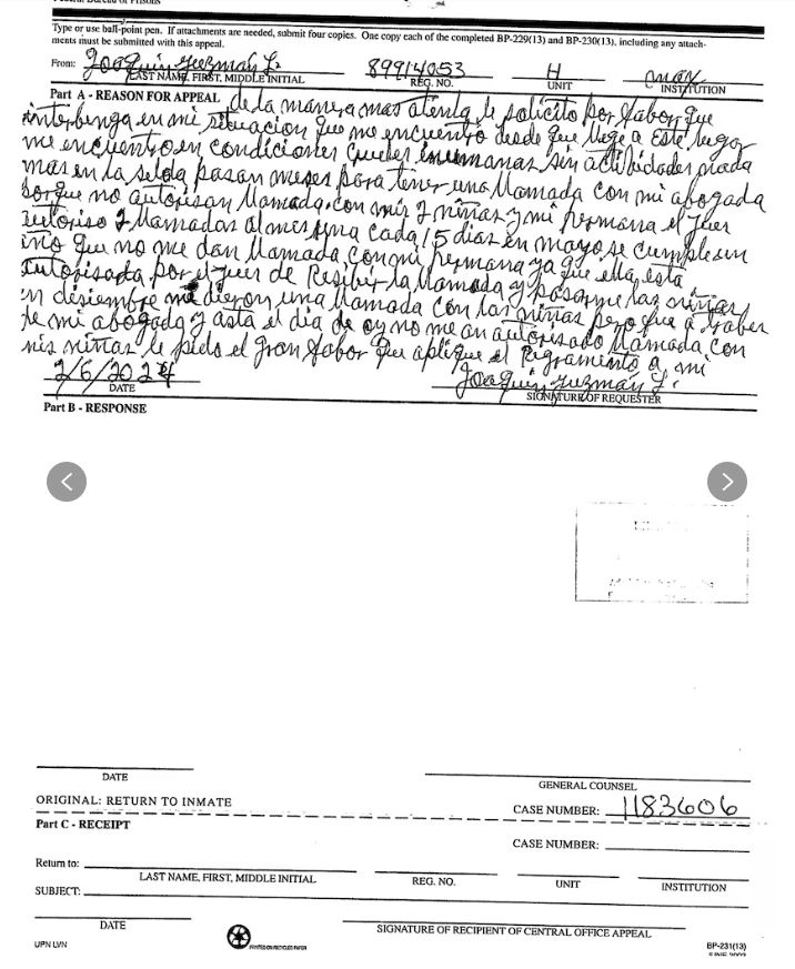 “Por las noches, me pongo los tapones en los oídos para poder dormir y para la alergia de la nariz compro medicamento aquí en la comisaría, pero no me hace provecho”, aseguró el capo sobre su estado de salud. El capo señaló que sus padecimientos (en sus palabras: depresión, dolores de cabeza y pérdida de memoria) se han agravado y ha pedido que ser atendido por especialista. Guzmán refiere que tiene autorizadas llamadas con sus hijas y una hermana una vez al mes, aunque denuncia que han pasado periodos de más de medio año sin contactarlas y quiere que se permita a su mujer visitarlo. “Me dirijo a usted de la manera más atenta. Perdón que lo moleste otra vez con la solicitud que le hecho antes respecto a mi esposa, Emma Coronel”, escribió a Cogan en abril. “Mi esposa está en California y puede visitarme seguido”, expuso. “Es la única persona de mi familia que podría visitarme”, agregó. El juez rechazó la petición, al argumentar que su tribunal “no tiene poder” para cambiar su régimen de visitas. Sin nada que perder, las cartas siguen llegando al correo de los involucrados.