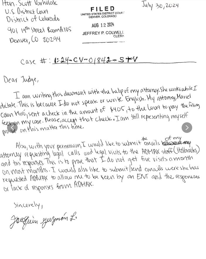 El Chapo ha enviado cientos y cientos de páginas desde la cárcel. A veces escribe al sistema penitenciario para pedir más tiempo fuera de su celda, para exigir que se le permitan más visitas de su esposa Emma Coronel y sus dos hijas de 13 años o para que se le faciliten materiales y cursos de inglés. En otras ocasiones analiza minuciosamente los testimonios de otros capos en su contra, se deslinda de sus antiguos aliados y viejas acusaciones e insiste para que una corte de apelaciones reconsidere su caso. Envía también correspondencia para exigir clemencia al juez Brian Cogan, el hombre que dictó su futuro y que lo condenó a cadena perpetua. Antes de asumir su defensa, el capo reclamó el año pasado que no se le facilitaron documentos clave para su caso y envió una misiva al entonces presidente Andrés Manuel López Obrador para pedir su intervención.