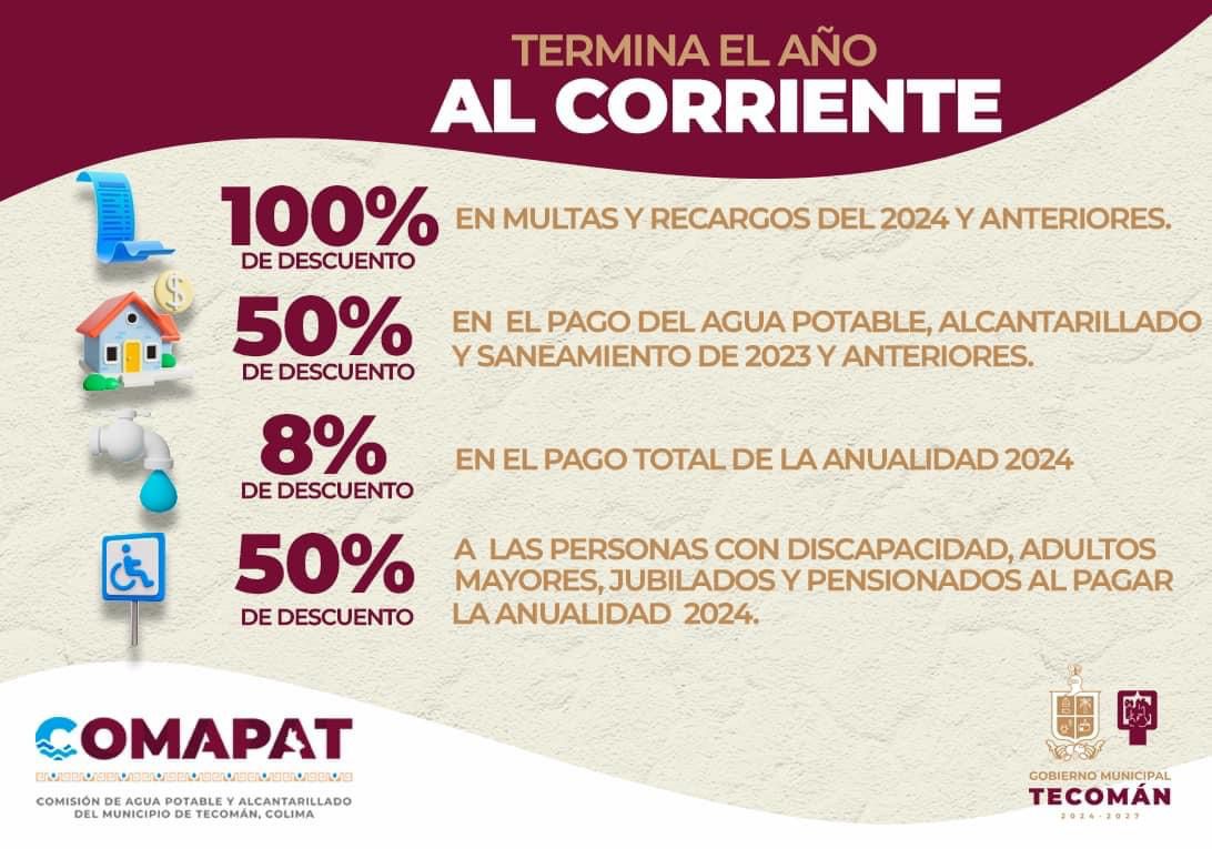 Este miércoles, el CP. J Jesús Rojas Fermín, Encargado del Despacho de la Dirección General de la Comisión de Agua Potable y Alcantarillado Público del Municipio de Tecomán (COMAPAT), informó que el organismo mantiene vigentes descuentos para los usuarios que presenten adeudos en 2024 y años anteriores.