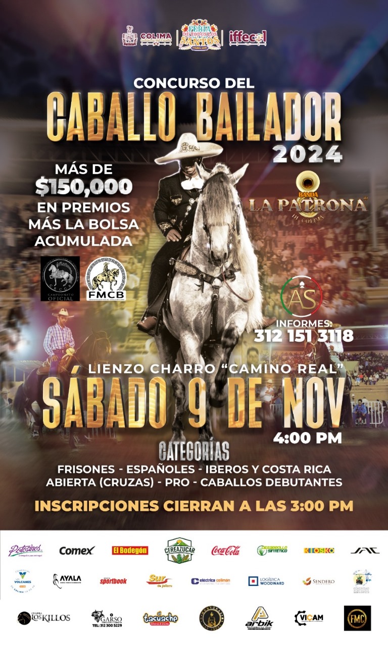 Este sábado 9 de noviembre desde las 4:00 de la tarde se desarrollará en el Lienzo Charro Camino Real de Colima el concurso del caballo bailador con entrada gratuita, donde participarán alrededor de cien jinetes que harán bailar a sus corceles en esta competencia que forma parte de las actividades de la edición 85 de la Feria de Todos los Santos, que se realiza desde el 31 de octubre y hasta el 17 de noviembre.
