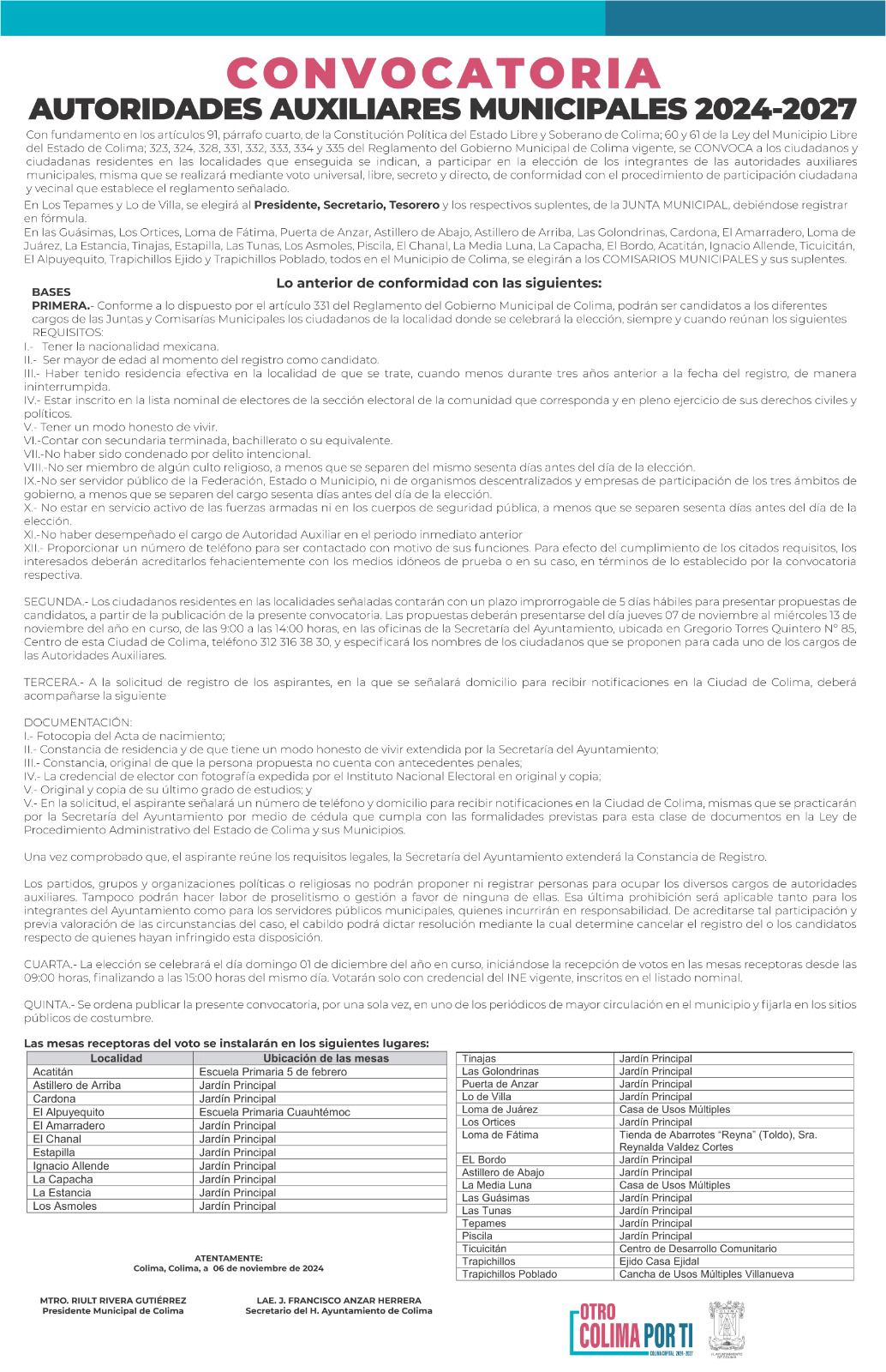 Colima, Col., 7 de noviembre de 2024.- El Cabildo del Ayuntamiento de Colima ha aprobado la convocatoria para la elección de autoridades auxiliares municipales para el período 2024-2027. Se invita a la ciudadanía de las diversas localidades a participar activamente en este proceso democrático. 🗳️