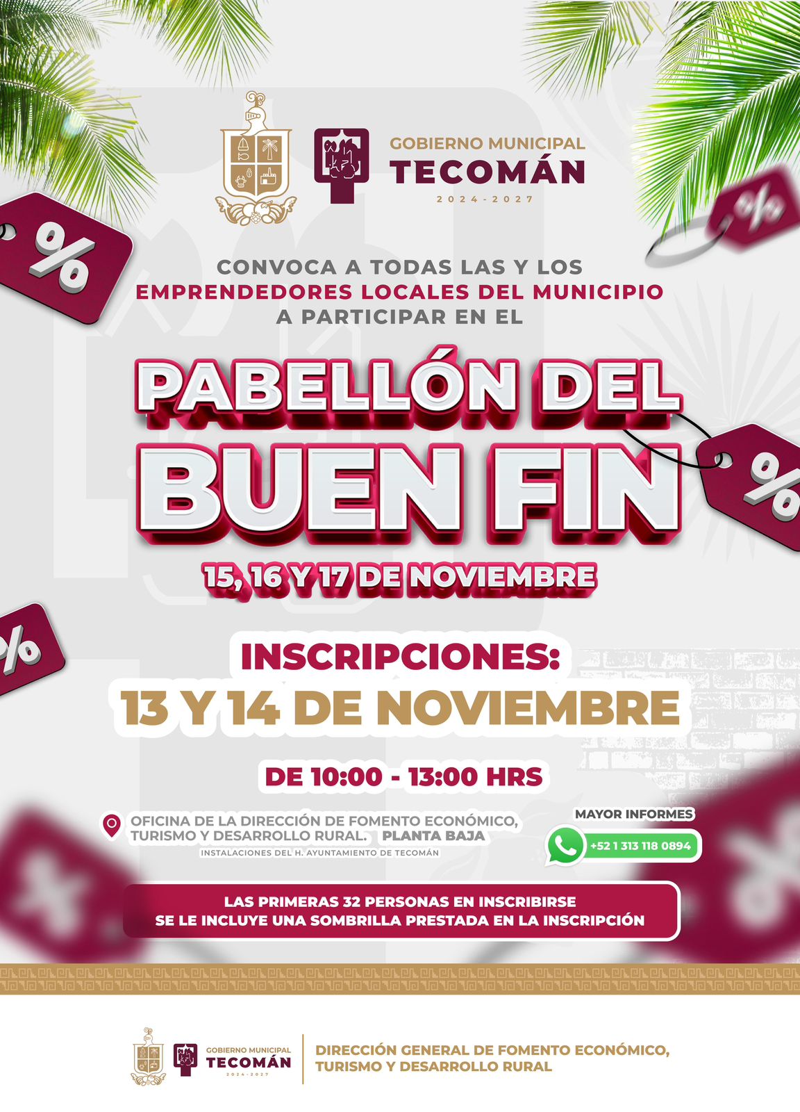 Con el objetivo de apoyar la economía del municipio y ofrecer espacios seguros para emprendedores del municipio, el Gobierno Municipal de Tecomán a través de la Dirección de Fomento Económico, invitan a la población a participar en el “PABELLÓN DEL BUEN FIN”, el cual se llevará a cabo los días 15, 16 y 17 de noviembre en el andador López Mateos.