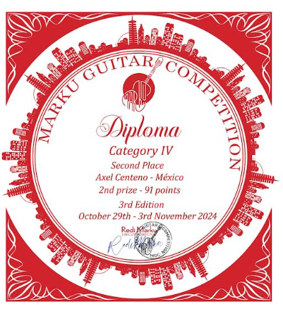 Axel Centeno se destacó en esta categoría entre numerosos competidores de alto nivel y posicionando a México en el ámbito internacional de la música clásica. Para el concurso, este joven guitarrista interpretó: “Por la patria”, con arreglos de Redi Marku y “Fandango Variado” Op. 16, de Dionisio Aguado.