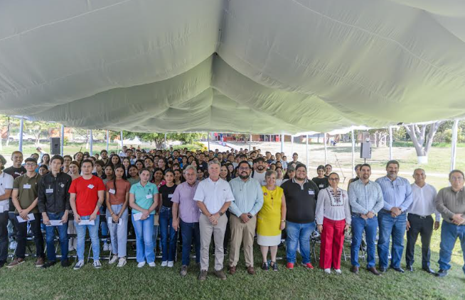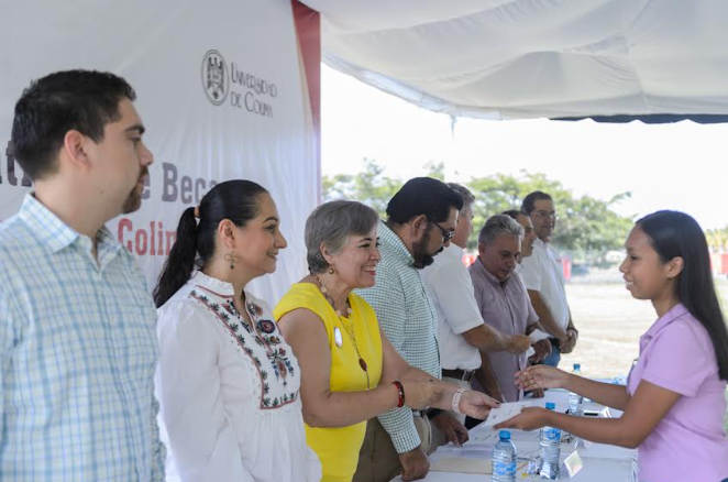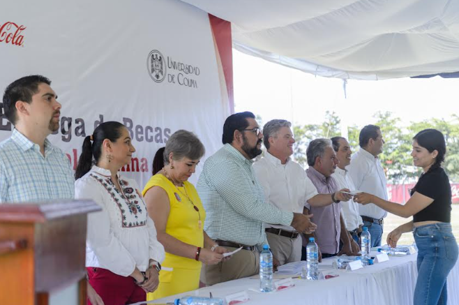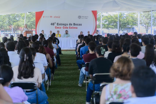 Este miércoles, 200 jóvenes del nivel Superior de la Universidad de Colima fueron beneficiados con las Becas Coca Cola en su edición número 46. La ceremonia de entrega se realizó en el Centro Social de la empresa. Presidieron el evento: Joel Nino Jr., secretario general de la UdeC en representación del rector, Christian Jorge Torres Ortiz Zermeño y Francisco Brun González, director adjunto de Embotelladora de Colima.