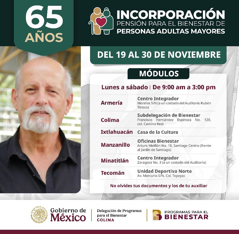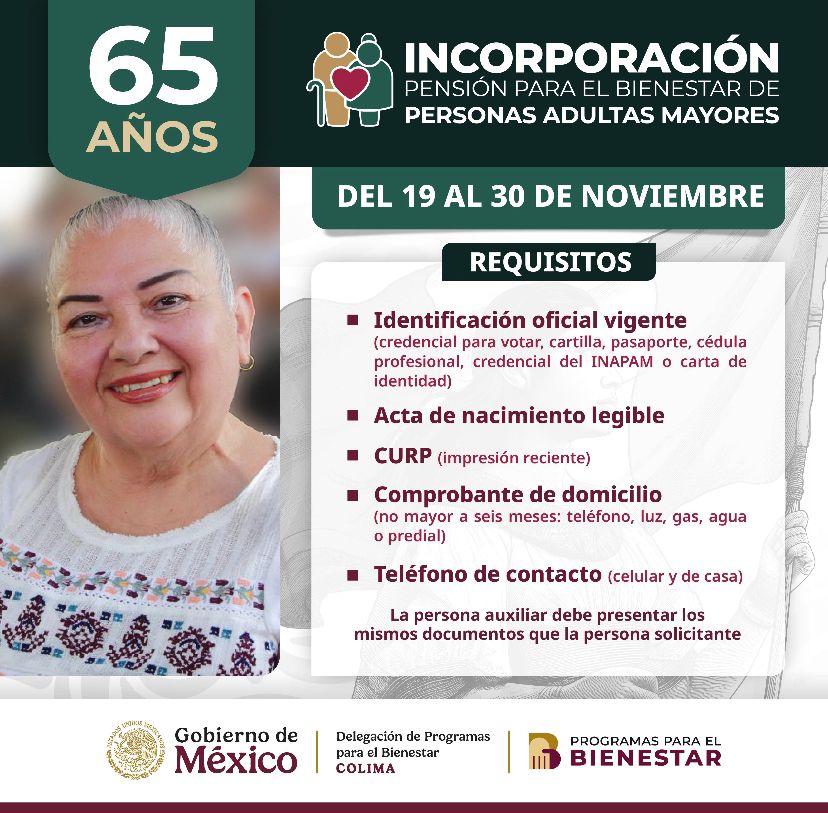 En Colima, del 19 al 30 de noviembre se lleva a cabo el registro a la Pensión para el Bienestar de las Personas Adultas Mayores que cumplieron o cumplen 65 años o más al 31 de diciembre