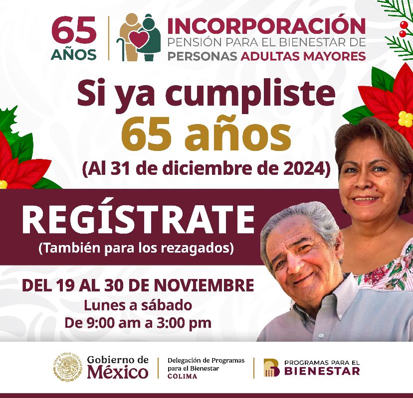 La delegada de Bienestar en Colima, María del Rosario Silva Verduzco, informó que del 19 al 30 de noviembre se realizará el registro de incorporación a la Pensión para el Bienestar de las Personas Adultas Mayores para quienes cumplieron o cumplen 65 años o más al 31 de diciembre de 2024.