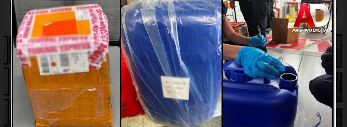 -En Toluca, elementos de la Guardia Nacional y de Aduanas, al realizar una inspección en una empresa de paquetería, localizaron un recipiente de plástico, procedente de Hong Kong; asegurando 27.4 kilos de bromuro de feniletilo (precursor de fentanilo).