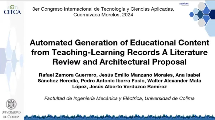 Un grupo de talentosos jóvenes que cursan la Ingeniería en Computación Inteligente de la Facultad de Ingeniería Mecánica y Eléctrica (FIME) de la Universidad de Colima, presentaron su primer artículo titulado: “Automated Generation of Educational Content from Teaching-Learning Records: A Literature Review and Architectural Proposal”, en el 3er Congreso Internacional de Tecnología y Ciencias Aplicadas (CITCA), el pasado 20 de noviembre.