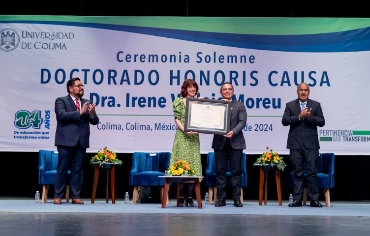 La mañana de este martes, la reconocida filóloga, escritora y periodista española, Irene Vallejo Moreu, en ceremonia solemne realizada en un Teatro Universitario lleno en su planta baja, fue distinguida con el grado de Doctora Honoris Causa por la Universidad de Colima, por sus contribuciones en la filología, la historia, la filosofía, la literatura y el alto compromiso con la difusión del conocimiento.