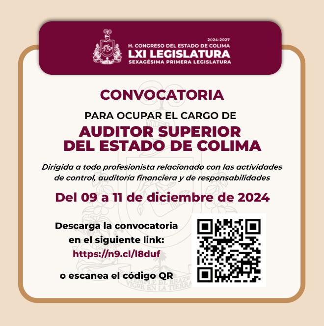 En reunión de la Junta de Gobierno y Coordinación Política (JUCOPO), del Congreso del Estado de Colima, se aprobó la expedición de la convocatoria para elegir a la persona que fungirá como auditor superior del Órgano Superior de Auditoría y Fiscalización Gubernamental del Estado de Colima (OSAFIG) para un periodo de siete años.