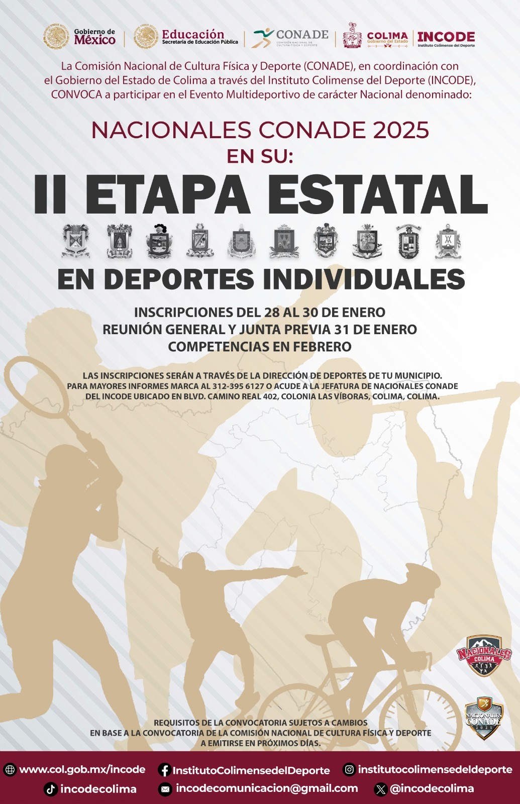 El Gobierno del Estado de Colima, a través del Instituto Colimense del Deporte (Incode), prepara la segunda etapa estatal que contempla las competencias de los deportes individuales, a realizarse durante el mes de febrero, con miras a definir las y los seleccionados para las etapas de macrorregionales y regionales de la justa deportiva Nacionales Conade 2025, señaló, Alejandro Rodríguez Alvarado, director general del Incode.