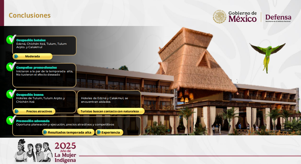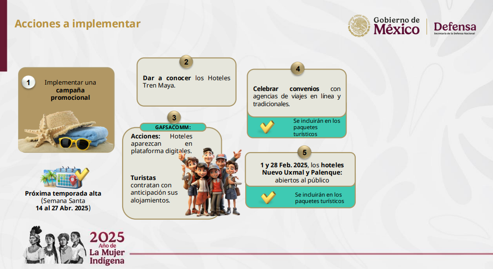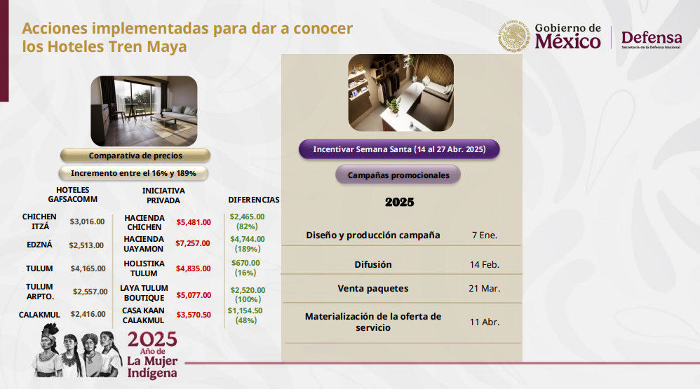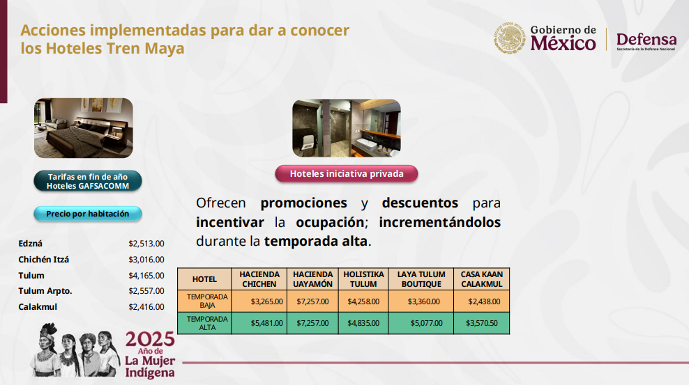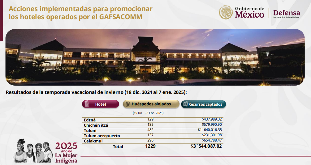 El director del Grupo Aeroportuario, Ferroviario de Servicios Auxiliares y Conexos Olmeca-Maya-Mexica (GAFSACOMM), Adolfo Héctor Tonatiuh Velasco Bernal, informó que durante la temporada de invierno, lo hoteles del Tren Maya registraron mil 229 huéspedes en cinco de los siete hoteles; además de promocionar paquetes turísticos con precios accesibles desde 2 mil 98 pesos por tres días y dos noches, hasta 20 mil 587 por cuatro días y tres noches, incluyendo transporte aéreo con Mexicana de Aviación desde el AIFA, el hospedaje, alimentos, acceso a parques y museos. Además, estos paquetes continuarán hasta Semana Santa, temporada en la que se ofrecerán nuevos paquetes vacacionales.