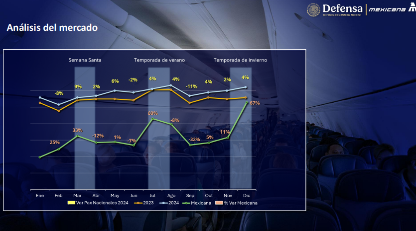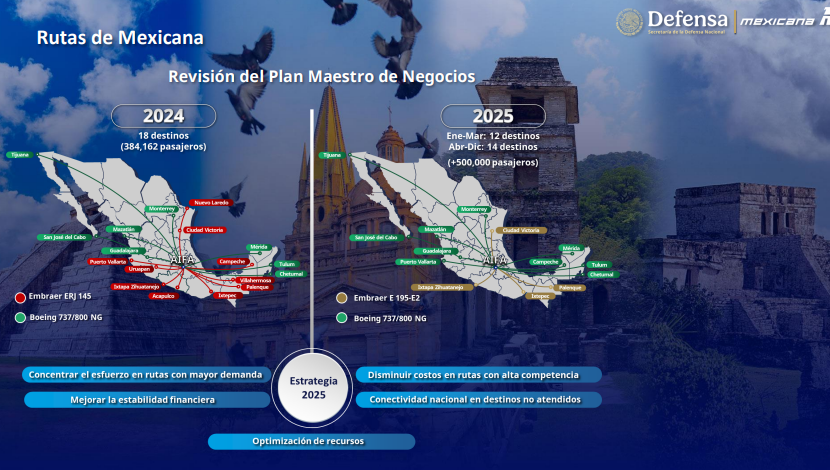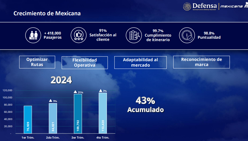 El director de Mexicana de Aviación, Leobardo Ávila Bojórquez, informó que al día de ayer ha transportado más de 418 mil pasajeros; con una satisfacción del 91 por ciento; 99 por ciento en el cumplimientos de los itinerarios y 98.8 por ciento de puntualidad, siendo la aerolínea más puntual que sale desde el AIFA, además destacó que la aerolínea presentó un crecimiento sostenido del 43 por ciento acumulado al cierre del 2024.