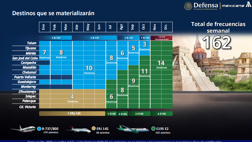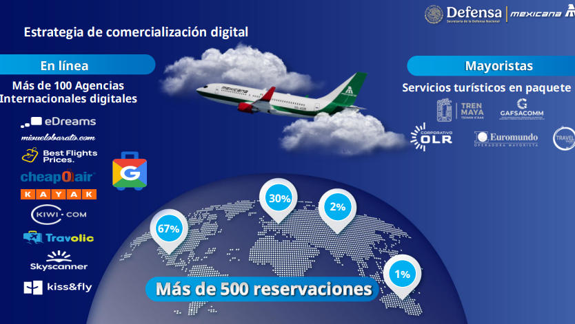 Informó que se emplearán nuevas estrategias como la implementación de la nueva flotilla de aviones Embraer; además de que ya se ha establecido una alianza estratégica con más de 100 agencias internacionales, con lo que ha logado una reservación de más de 500 vendidos a nivel global; el 30 por ciento en Europa; 2 por ciento en el mercado asiático, uno por ciento en Oceanía y el 67 por ciento en México.