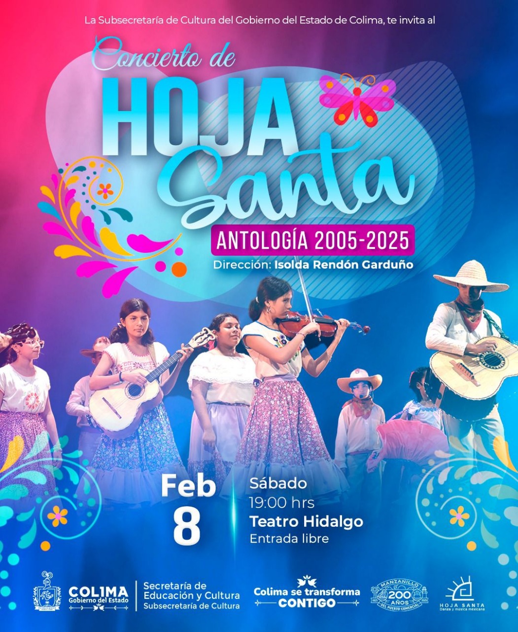 Después de la exitosa inauguración de la temporada 2025 del Teatro Hidalgo, la Subsecretaría de Cultura del Gobierno del Estado de Colima mantiene activa la cartelera del recinto artístico y cultural más importante y anuncia la próxima función gratuita a cargo de la agrupación de danza y música mexicana ‘Hoja Santa’.
