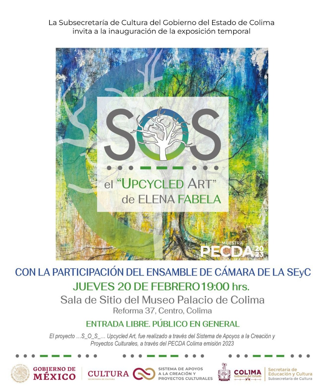 La Subsecretaría de Cultura del Gobierno del Estado de Colima anuncia la inauguración de una nueva exposición temporal de artes plásticas en el Museo Palacio de Gobierno de Colima; se trata del proyecto S.O.S. de la artista visual, Elena Fabela Velázquez, beneficiaria del Programa de Estímulos a la Creación y Desarrollo Artístico (PECDA).