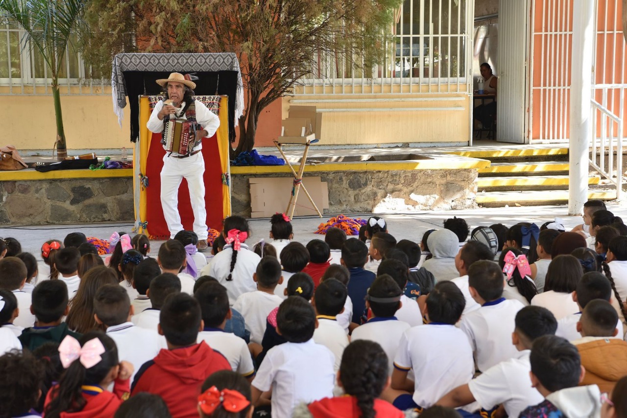 Este espectáculo, presentado por el Grupo Saltimbanqui, compañía que visita el estado desde la Ciudad de México, presenta la obra ‘Juan Calavera en el mercado’, puesta en escena que combina la música tradicional con la magia de los títeres de guante, para contar a las pequeñas y pequeños una necesaria historia sobre problemáticas que enfrentan las y los campesinos, una oportunidad para generar sensibilidad y empatía en el público infantil.