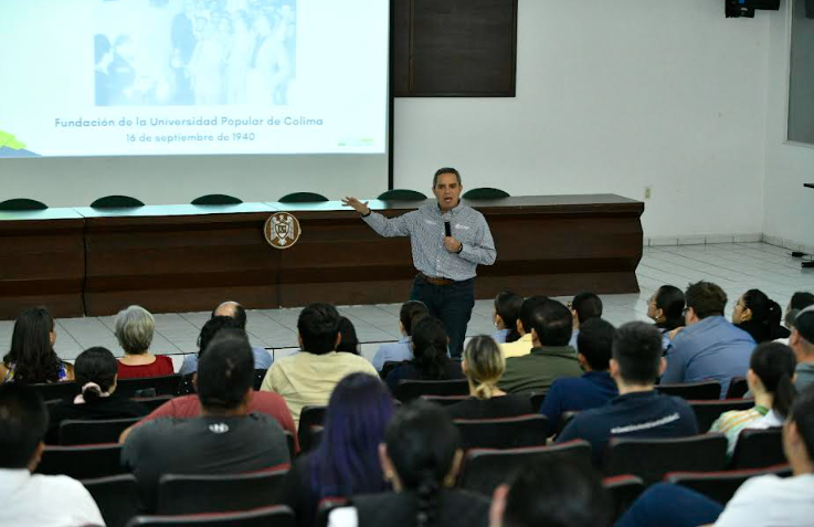 Durante su charla, el rector les habló de la fundación de la Universidad Popular de la Universidad de Colima en 1940, de los lineamientos y ejes de trabajo que desarrollará la institución los próximos cuatro años y de los aspectos particulares que distinguen el trabajo en esta casa de estudios.