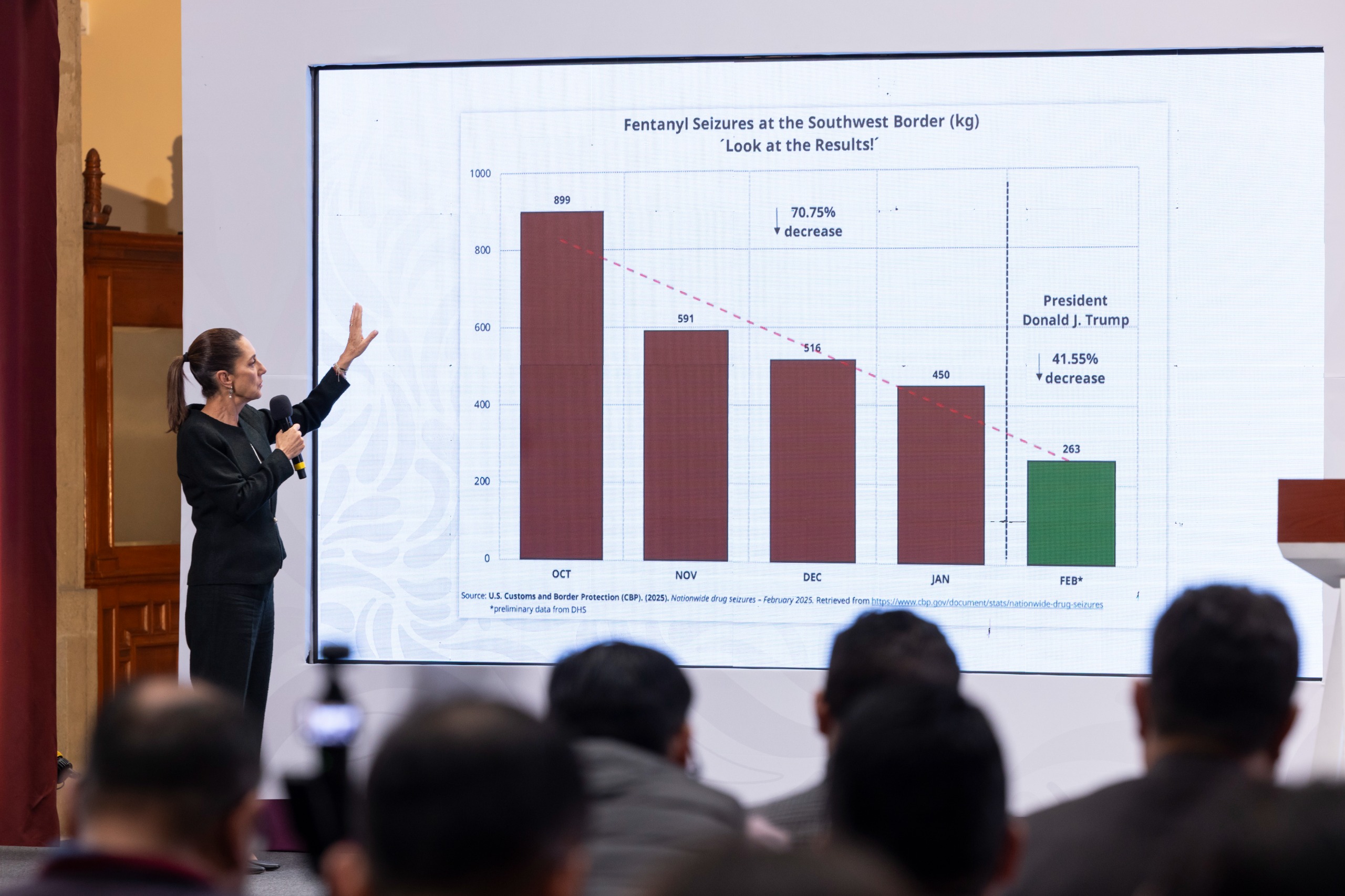 Explicó que durante la llamada le expuso al Presidente Trump una gráfica que muestra que los resultados que ha tenido el Gobierno de México particularmente en febrero se reflejan en una reducción de 41.5 por ciento en las incautaciones de fentanilo en la frontera, de acuerdo con datos del Customs and Border Protection (CBP) de los EUA.