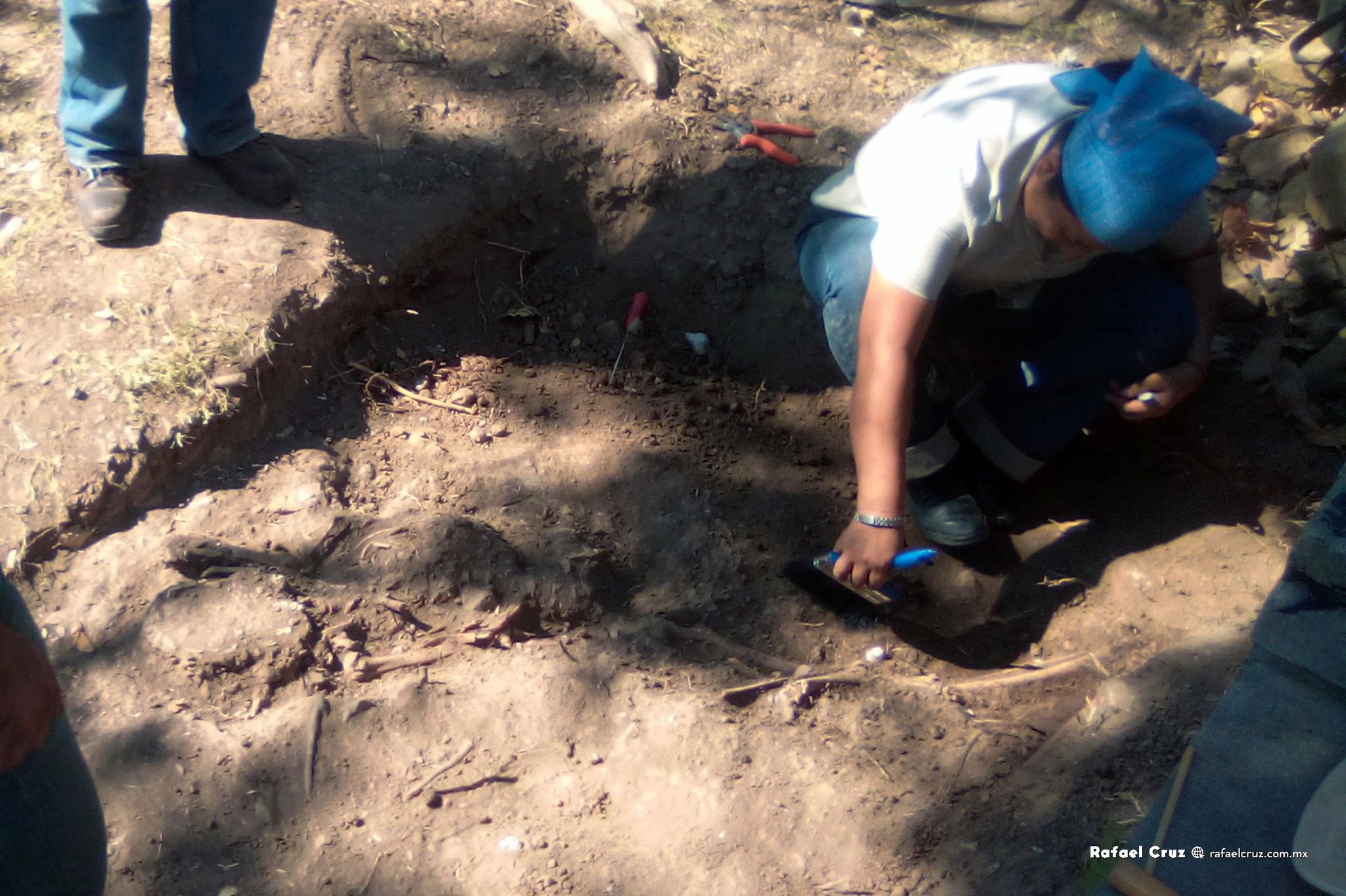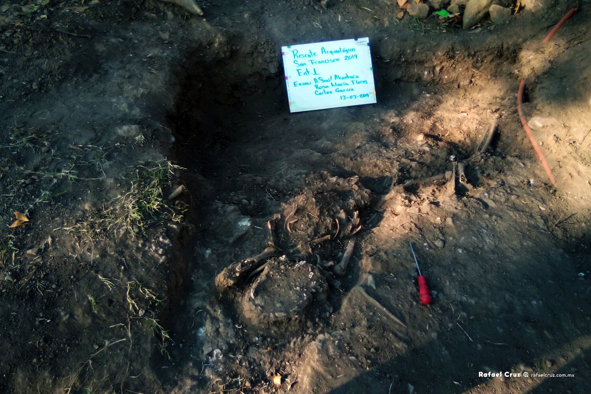 El tiempo hizo su trabajo en San Francisco de Almoloyan. El INAH explicó que, el arrastre de tierra con el paso de los años y la limpieza del jardín, ayudó a su desvelamiento, aunque también estos factores iban destruyendo parcialmente la osamenta.