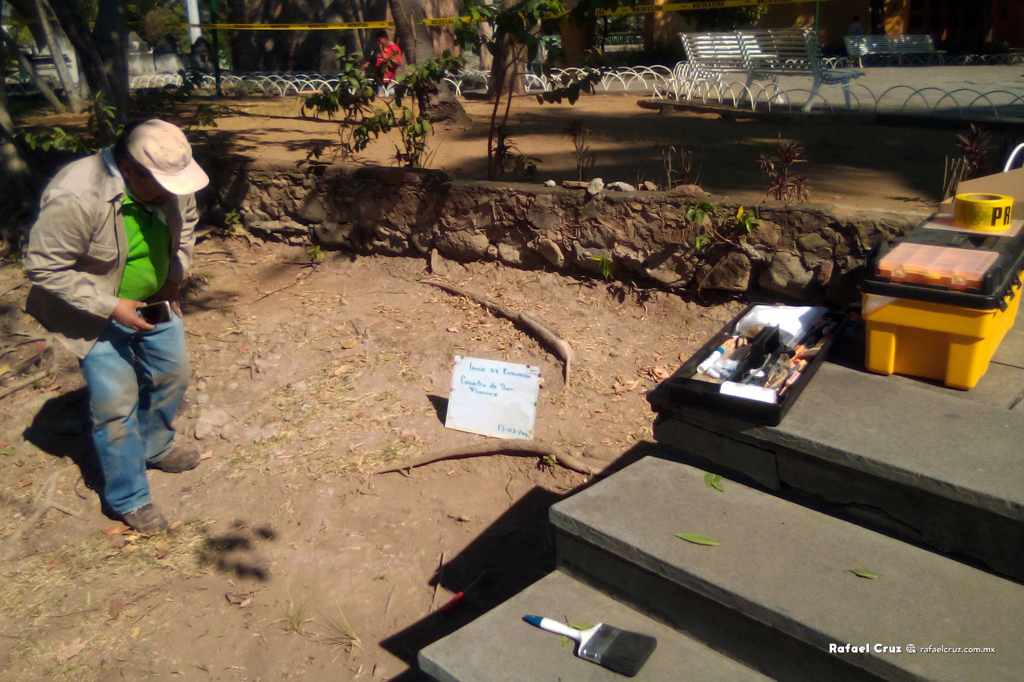 El 13 de marzo de 2019 por la mañana, dos antropólogos físicos y un arqueólogo, llegaron al Jardín de San Francisco de Almoloyan, en el corazón de la capital de Colima, derivado de un reporte ciudadano realizado a la Delegación en Colima, del Instituto Nacional de Antropología e Historia (INAH), el cual trataba de un descubrimiento arqueológico en plena vía pública.