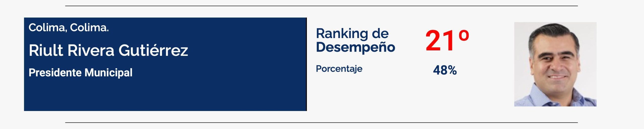 Campaigns and Elections México, ubicó a Riult Rivera, Presidente Municipal de Colima en el sitio 21 del Top50 del Ranking Mensual de Alcaldes y Alcaldesas de la categorías #MedianasUrbes dentro de los #RankingsdeMéxico que lleva a cabo esa empresa mes a mes para evaluar el trabajo de las autoridades del país.