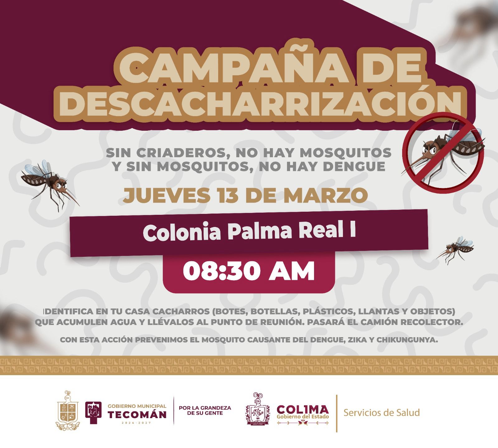 El Gobierno Municipal Tecomán, en conjunto con la Jurisdicción Sanitaria No. 2 y el Sector Salud, invitan a los vecinos de la colonia Palma Real I, a participar en la campaña de descacharrización, que se llevará a cabo este jueves 13 de marzo a las 8:30 de la mañana.