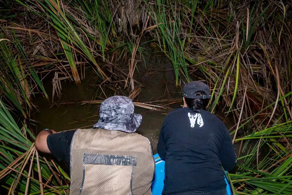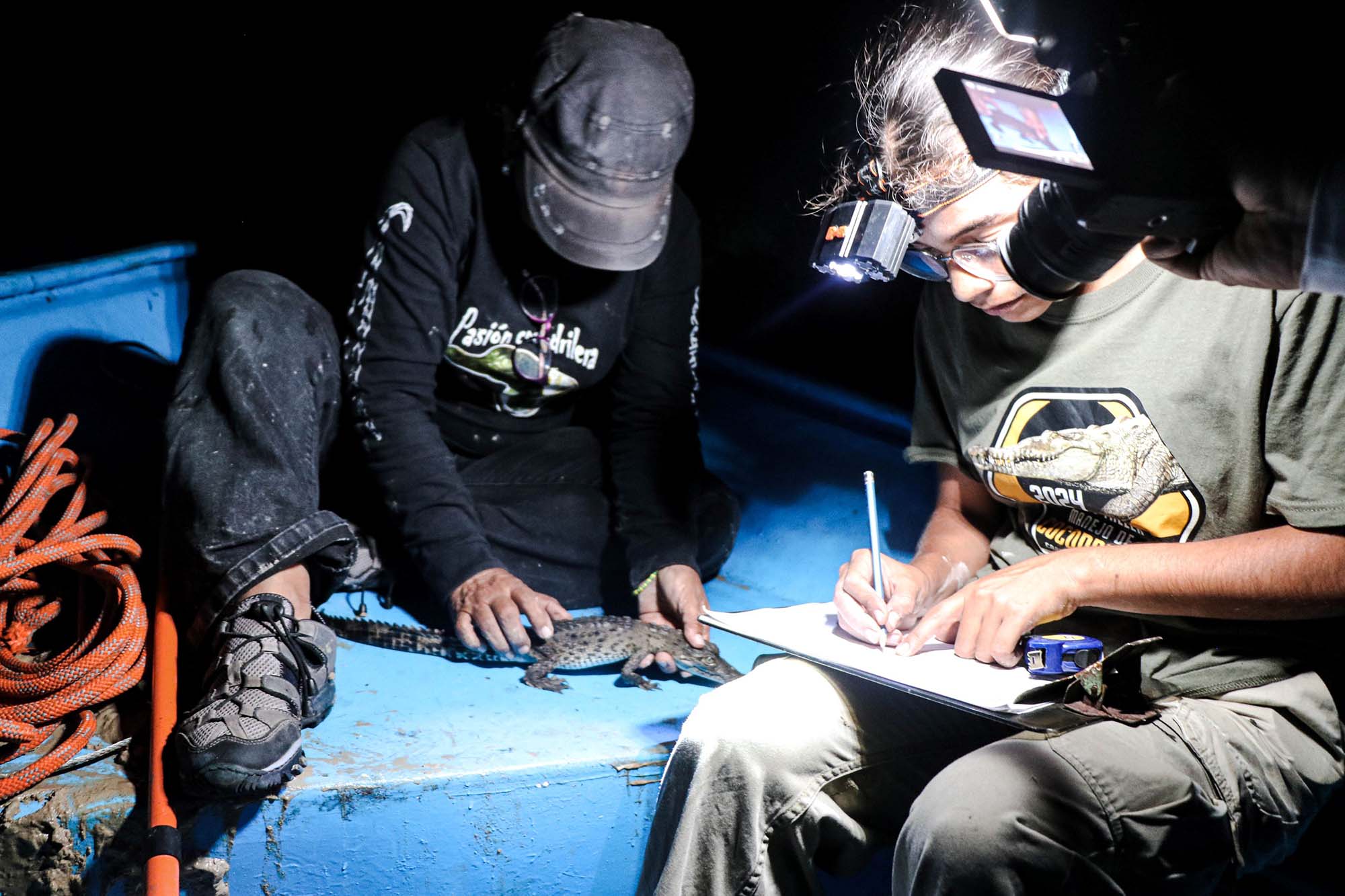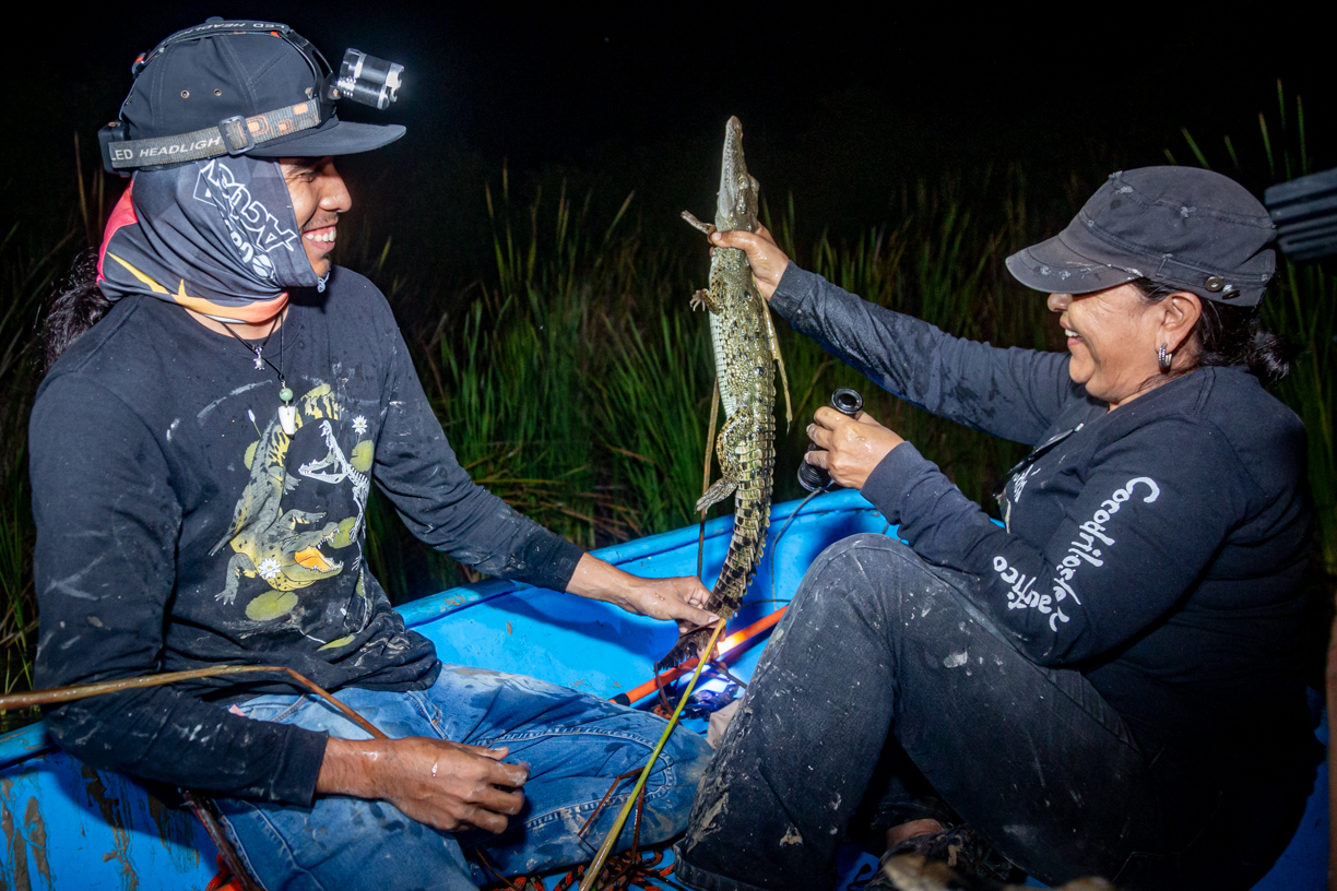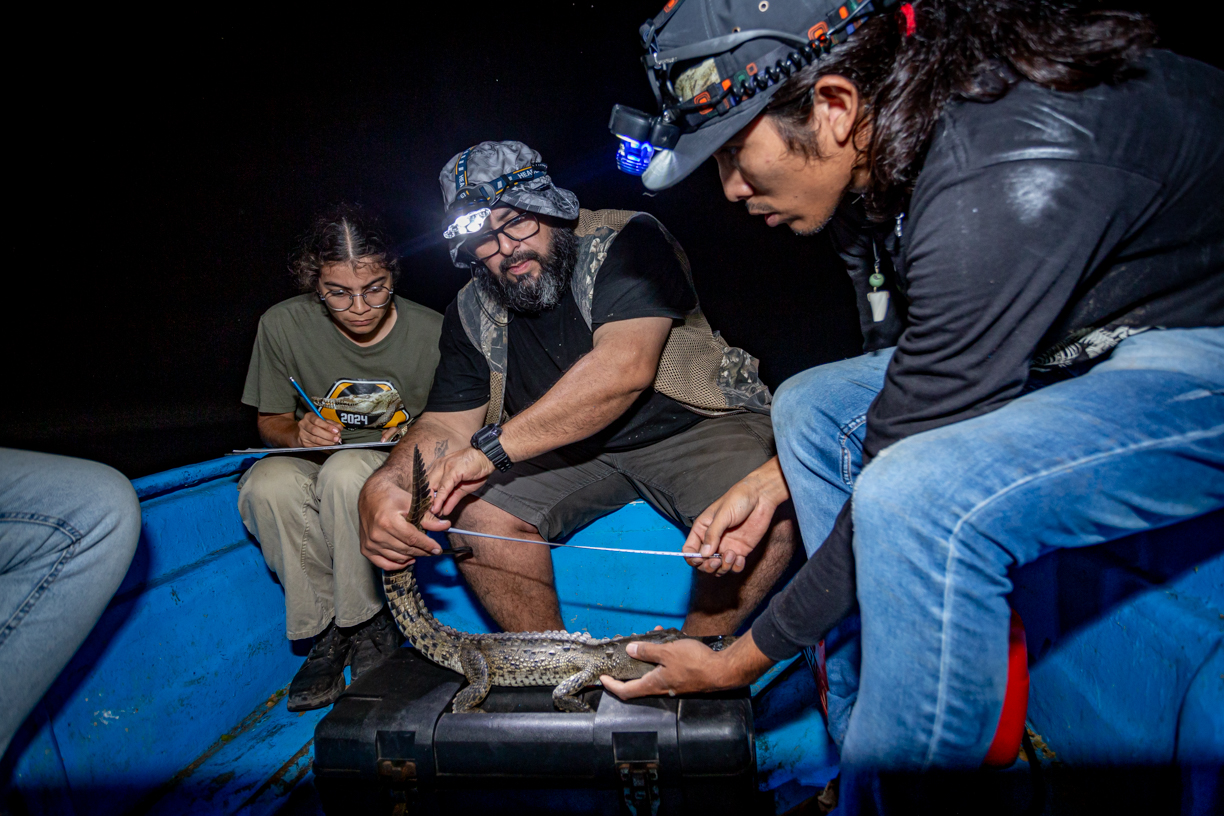 Una vez en las lanchas, el equipo de expertos, expertas y estudiantes se dedicó a la observación, registro y análisis de la población de estos reptiles en su hábitat natural. Durante la jornada, la noche fría, oscura y sin luna sirvió de cobijo para los excursionistas. A la intemperie, en plena laguna, lograron avistar más de treinta cocodrilos de río (Crocodylus acutus) flotando en el agua, con los ojos ligeramente rojos asomando justo sobre la superficie.