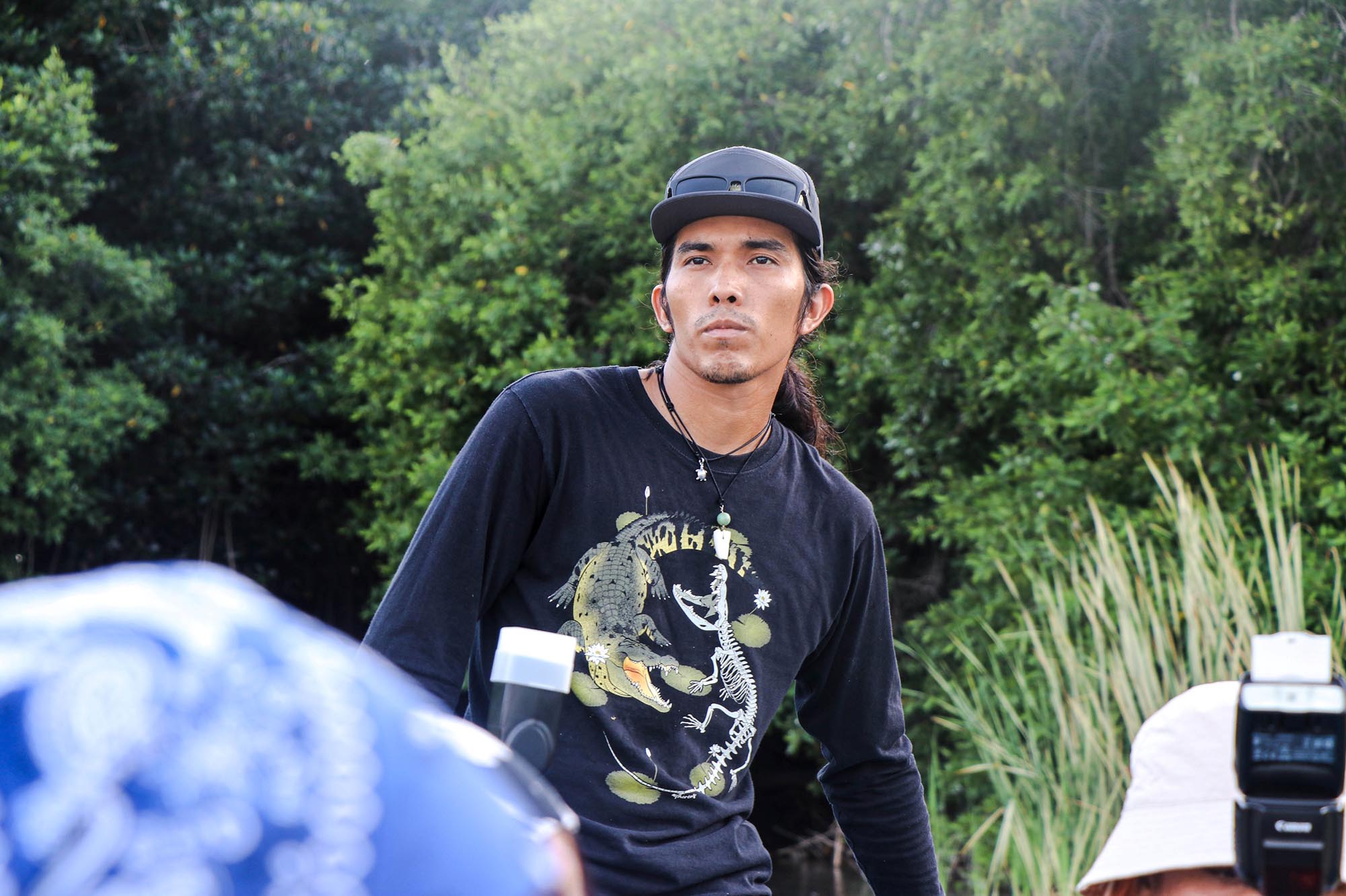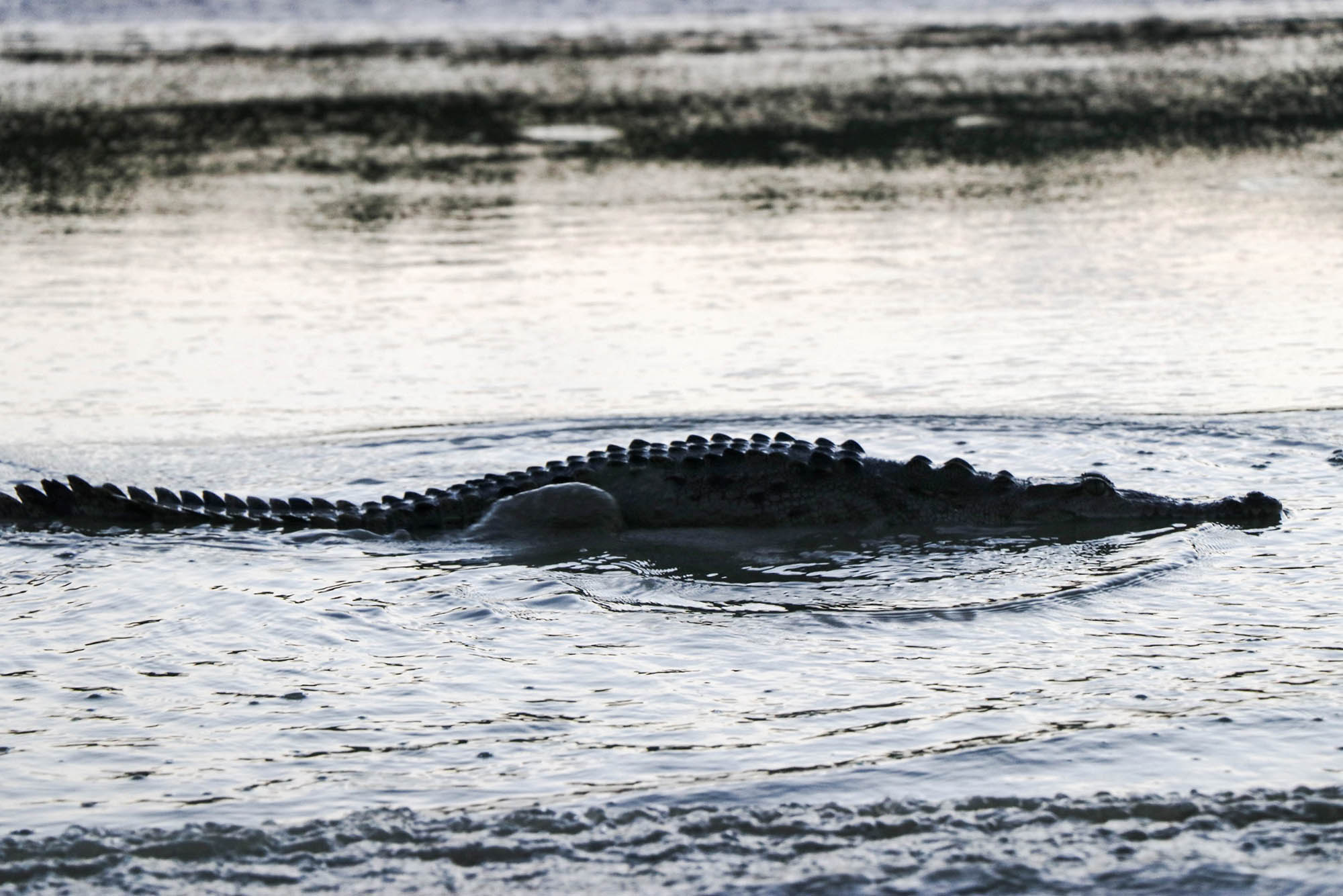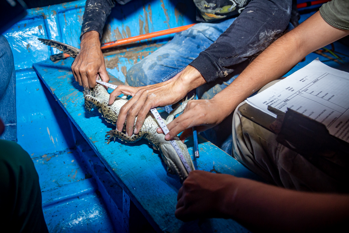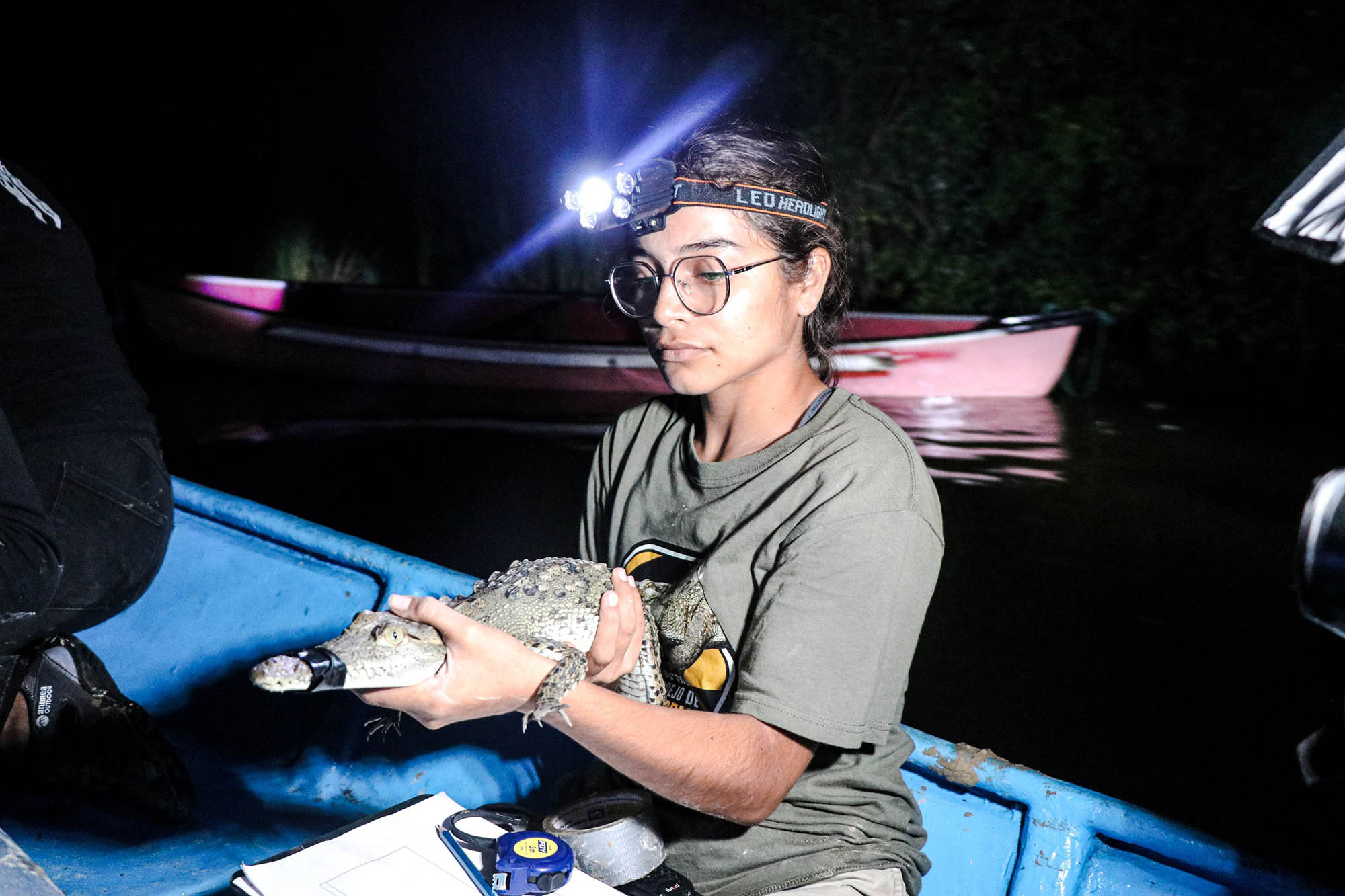 Una vez en las lanchas, el equipo de expertos, expertas y estudiantes se dedicó a la observación, registro y análisis de la población de estos reptiles en su hábitat natural. Durante la jornada, la noche fría, oscura y sin luna sirvió de cobijo para los excursionistas. A la intemperie, en plena laguna, lograron avistar más de treinta cocodrilos de río (Crocodylus acutus) flotando en el agua, con los ojos ligeramente rojos asomando justo sobre la superficie.