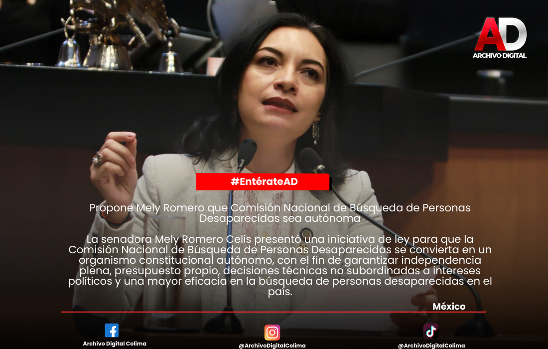 La senadora Mely Romero Celis presentó una iniciativa de ley para que la Comisión Nacional de Búsqueda de Personas Desaparecidas se convierta en un organismo constitucional autónomo, con el fin de garantizar independencia plena, presupuesto propio, decisiones técnicas no subordinadas a intereses políticos y una mayor eficacia en la búsqueda de personas desaparecidas en el país.