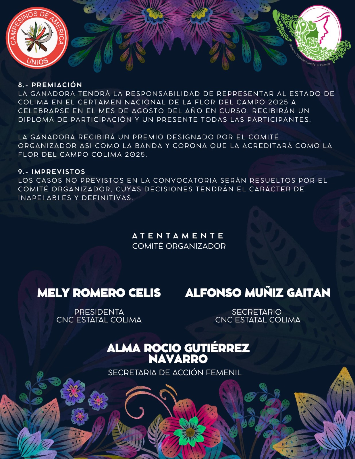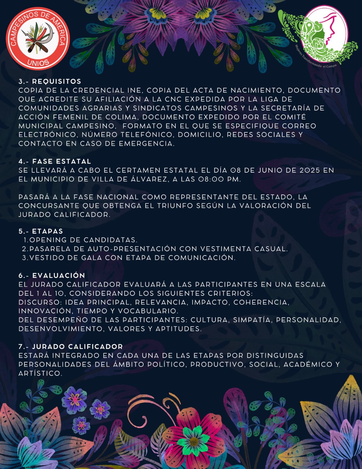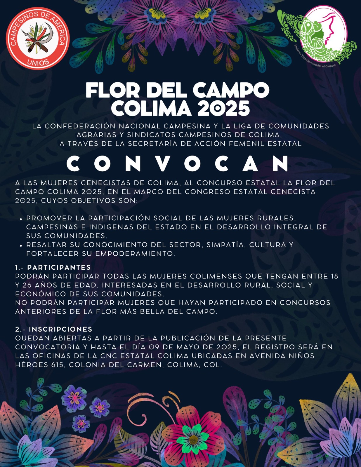 El certamen está dirigido a mujeres colimenses de entre 18 y 26 años de edad, originarias de comunidades campesinas o indígenas. Además de representar a su municipio, las aspirantes deberán estar involucradas, o dispuestas a participar, en proyectos de impacto social o productivo. La fecha límite de inscripción es el 09 de mayo, y el registro se realiza en las oficinas de la CNC Estatal, ubicadas en Av. Niños Héroes #615, colonia Del Carmen, en la ciudad de Colima.