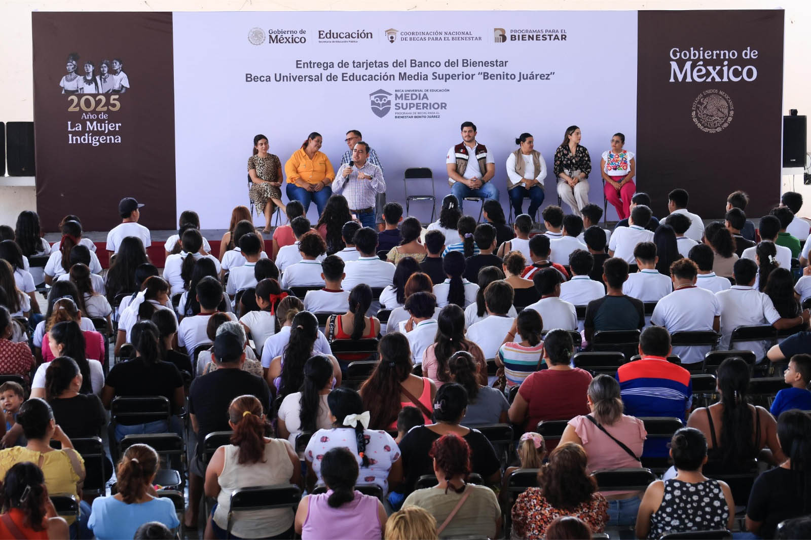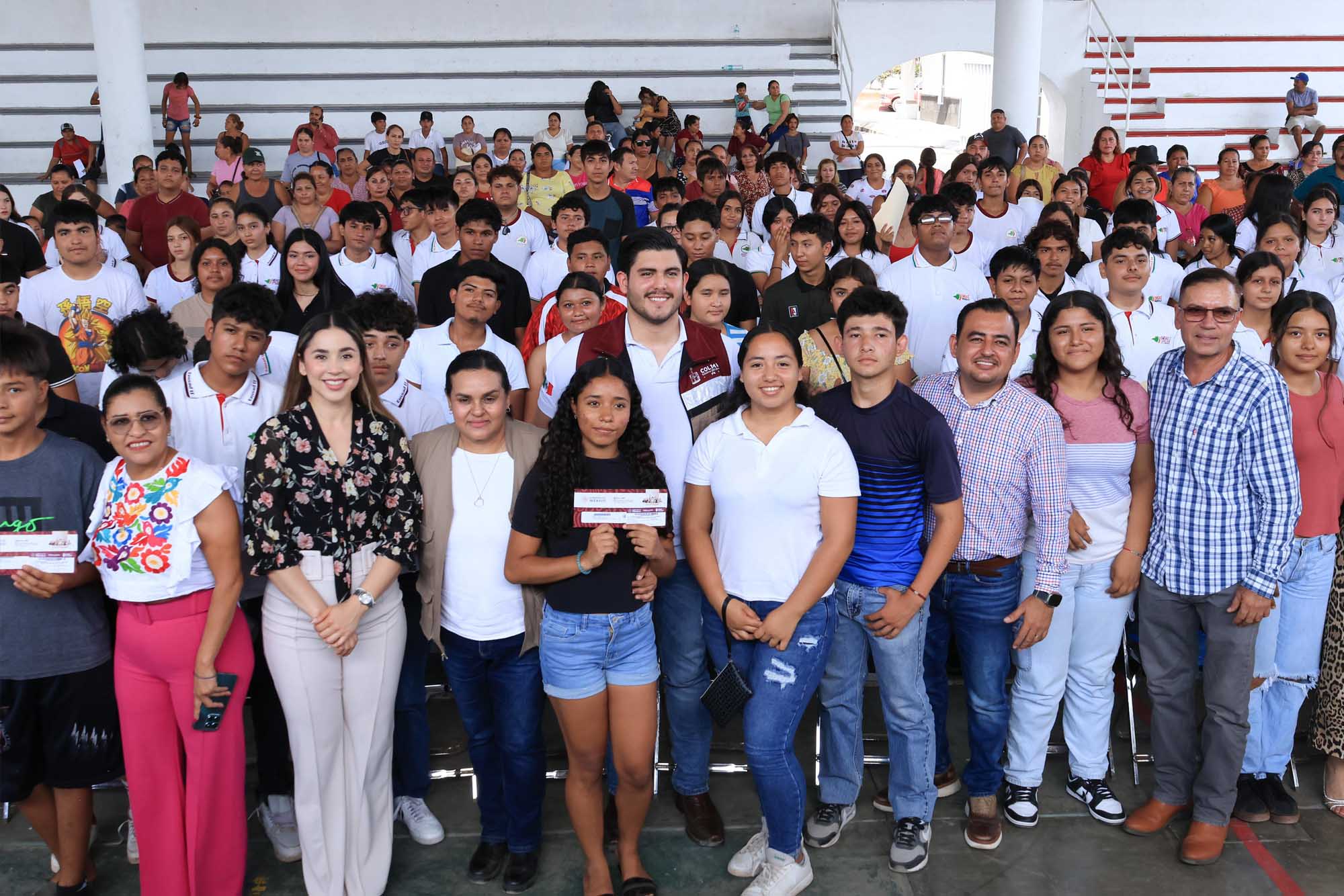 Por la mañana, acudió a la Universidad Intercultural de Colima, en el municipio de Comala, donde participó en una asamblea para la entrega de tarjetas del Banco del Bienestar a estudiantes beneficiarios de la Beca de Educación Superior “Jóvenes Escribiendo el Futuro”.