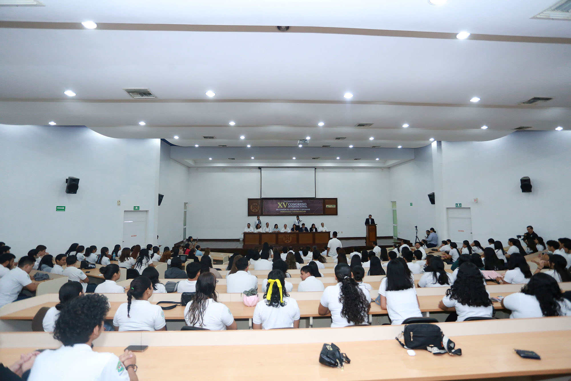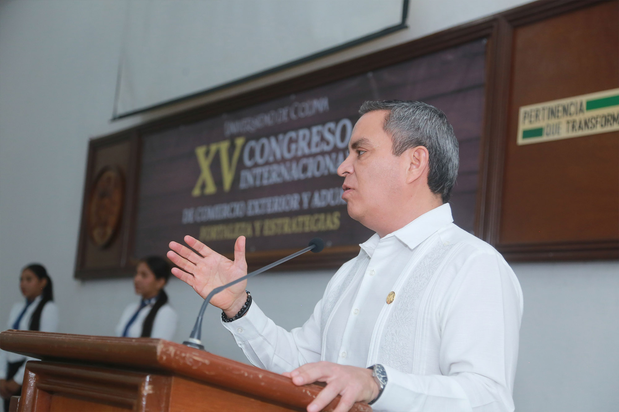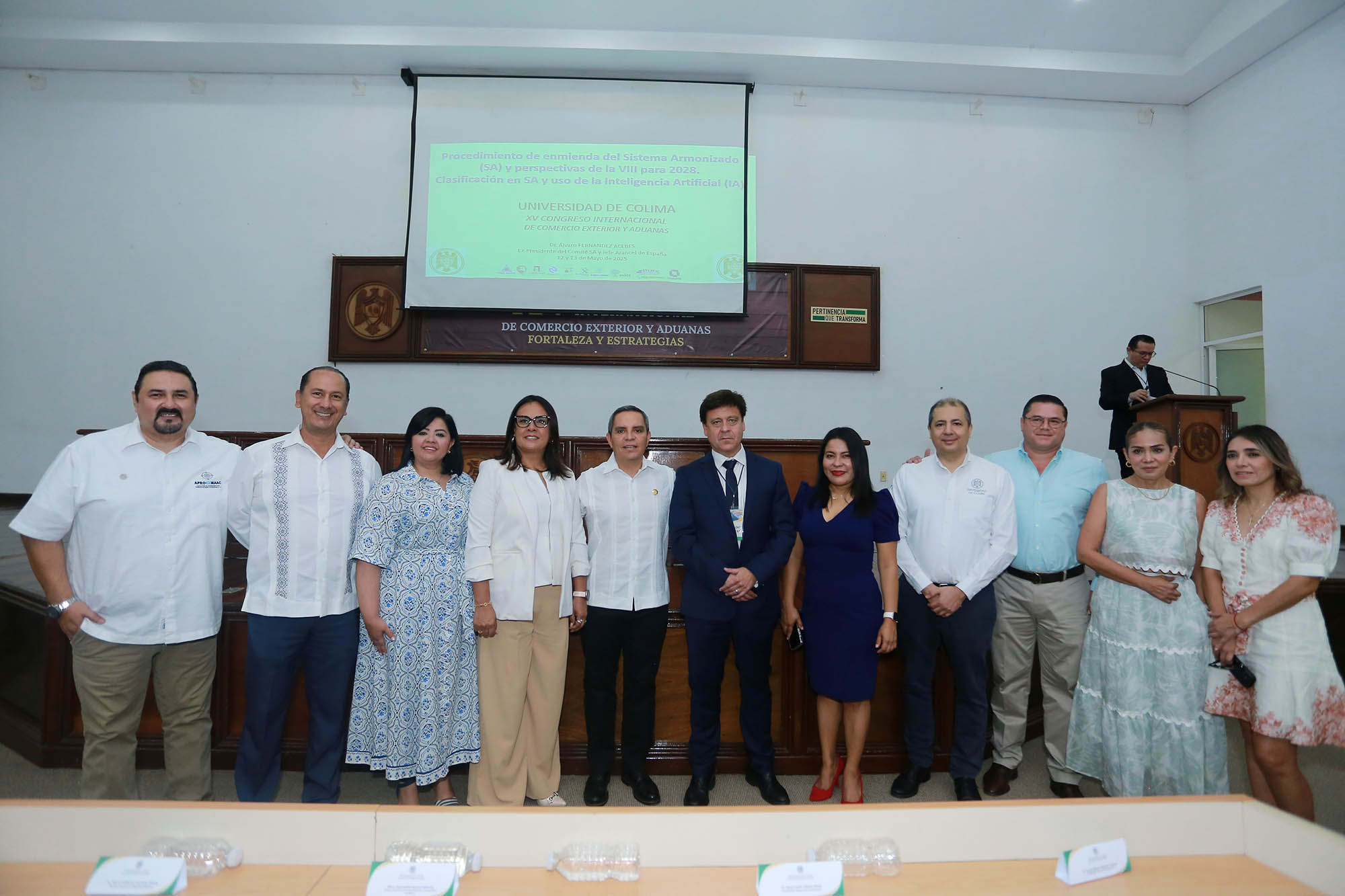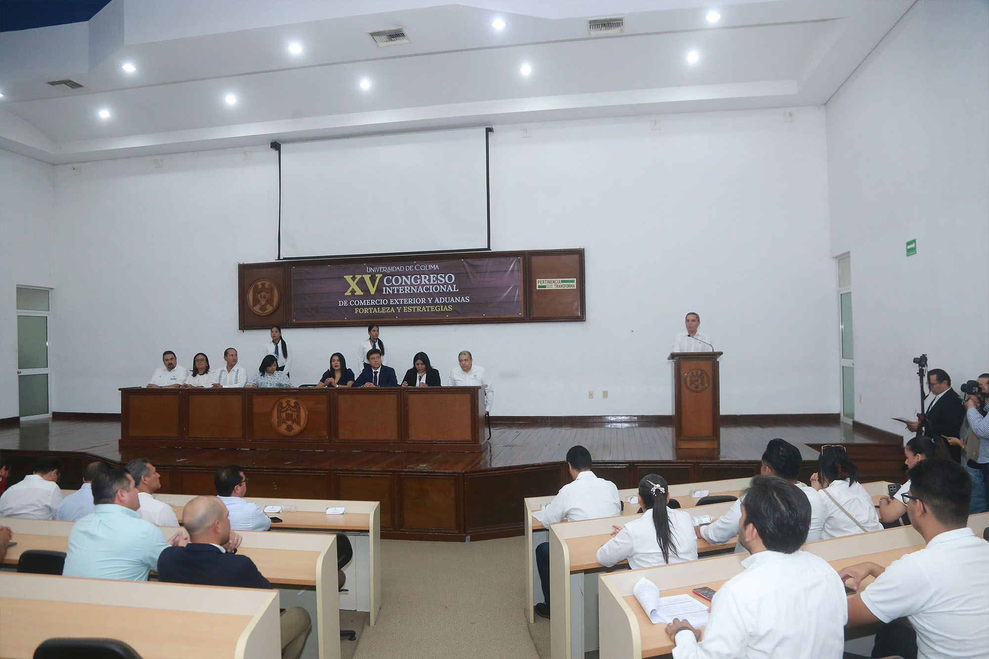 Finalmente agradeció por pensar en la Universidad de Colima para un evento de esta magnitud, pues nuestra institución “es el espacio idóneo para la discusión de temas relevantes que inciden en el desarrollo regional y nacional, como son el comercio exterior, las aduanas y el puerto. En este entorno económico de gran dinamismo, de cambios de las políticas arancelarias y una mayor evolución de la inteligencia artificial, es fundamental actualizar los conocimientos de estudiantes y profesionales del área para mejorar sus prácticas y su desempeño”.