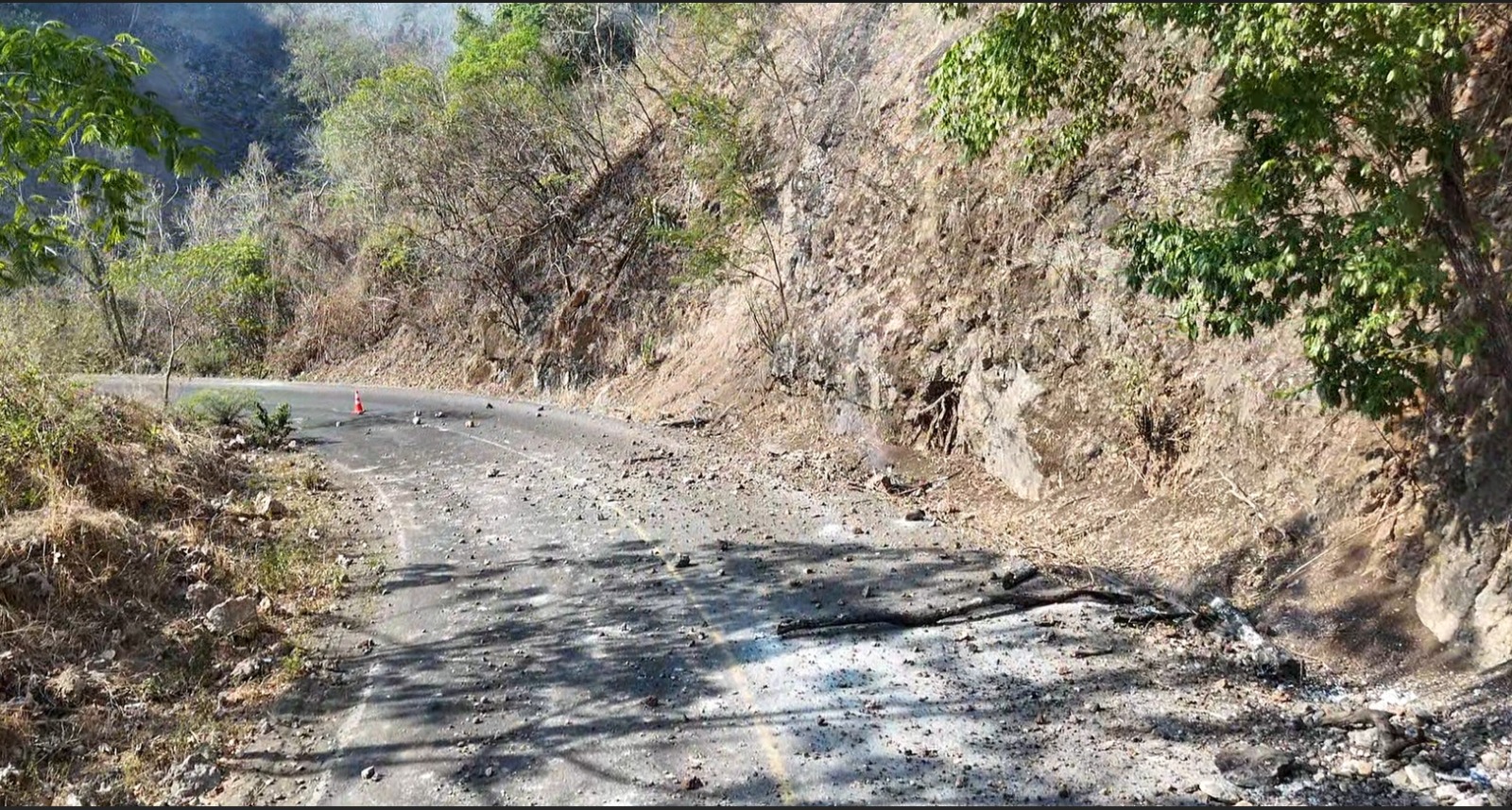 Como consecuencia de este incendio forestal se registra caída de material en el tramo del kilómetro 33 sobre la vía Villa de Álvarez a Minatitlán, lo que representa un riesgo para quienes transitan por esta carretera intermunicipal.