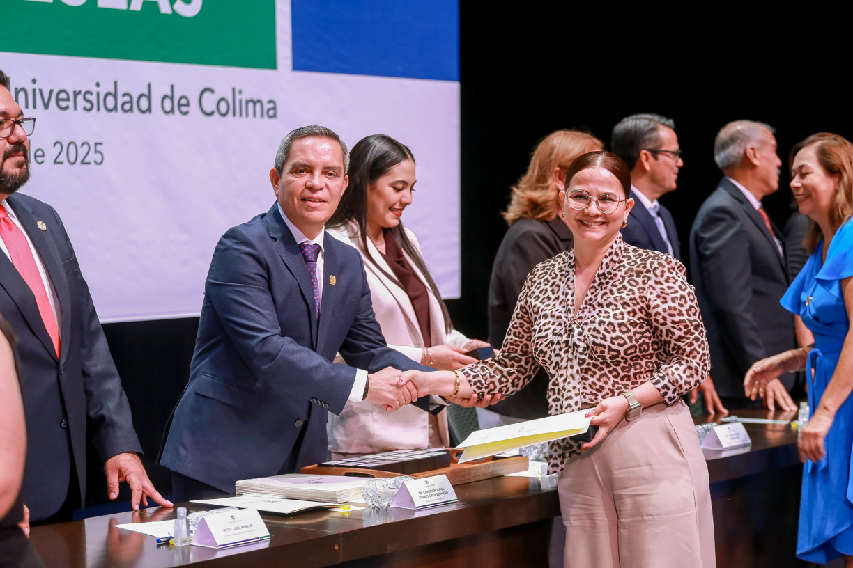 Las distinciones y reconocimientos, destacó, “representan historias de vida muy particulares y trayectorias productivas, pero, en lo colectivo, constituyen el trabajo decidido de la comunidad que ha construido y enriquecido esta Casa de Estudios, haciendo realidad las aspiraciones de una mejor formación académica para las y los colimenses”.