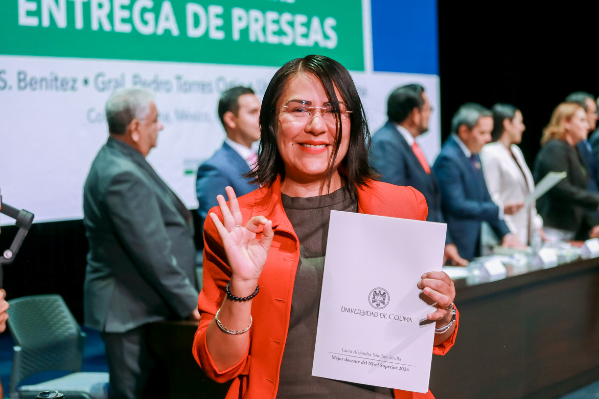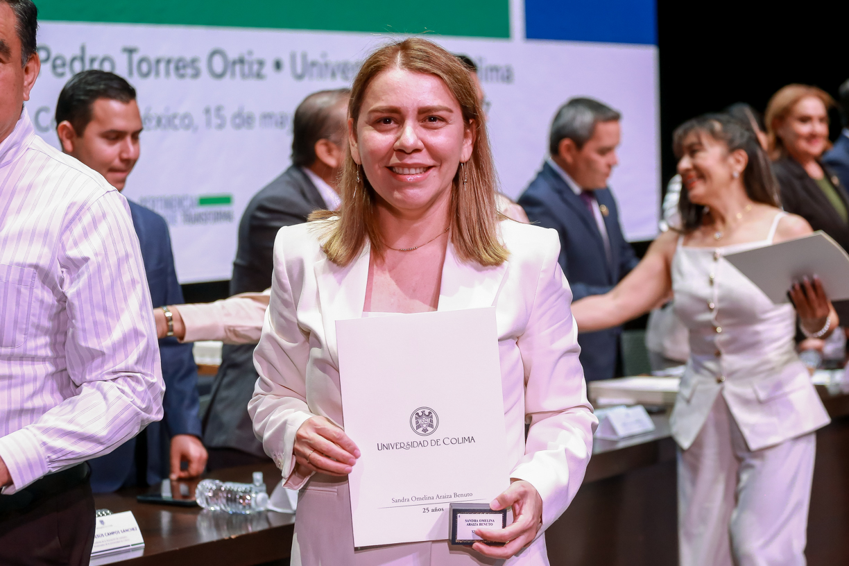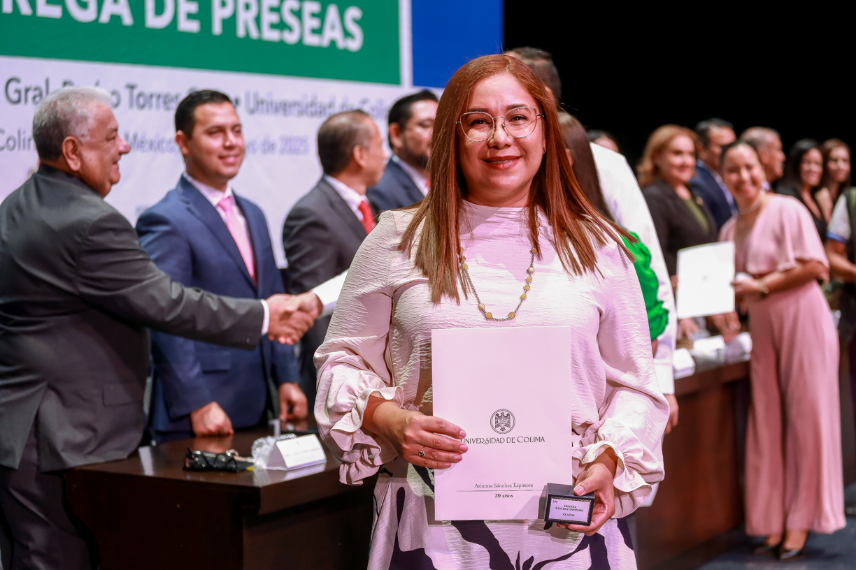 Este jueves, en el Teatro Universitario “Coronel Pedro Torres Ortiz”, se llevó a cabo la ceremonia de entrega de 429 preseas a las y los universitarios que cumplieron 15, 20 y 25 años de servicio en la institución, y se entregó reconocimiento a las y los mejores docentes de nivel medio superior y superior de 2024 de la Universidad de Colima (UdeC).