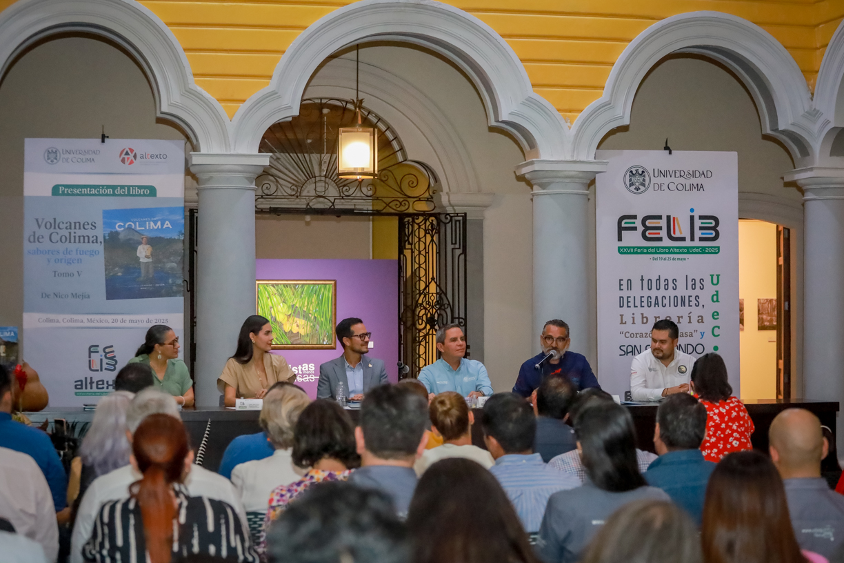 Como parte de la XXVII Feria del Libro 2025 de la Universidad de Colima (FELIB Altexto), se presentó la tarde del martes, en la Pinacoteca Universitaria, el libro “Volcanes de Colima: Sabores de Fuego y Origen”, que es el quinto volumen del proyecto editorial Colima, Una Gran Travesía Gastronómica, liderado por el chef Nico Mejía.