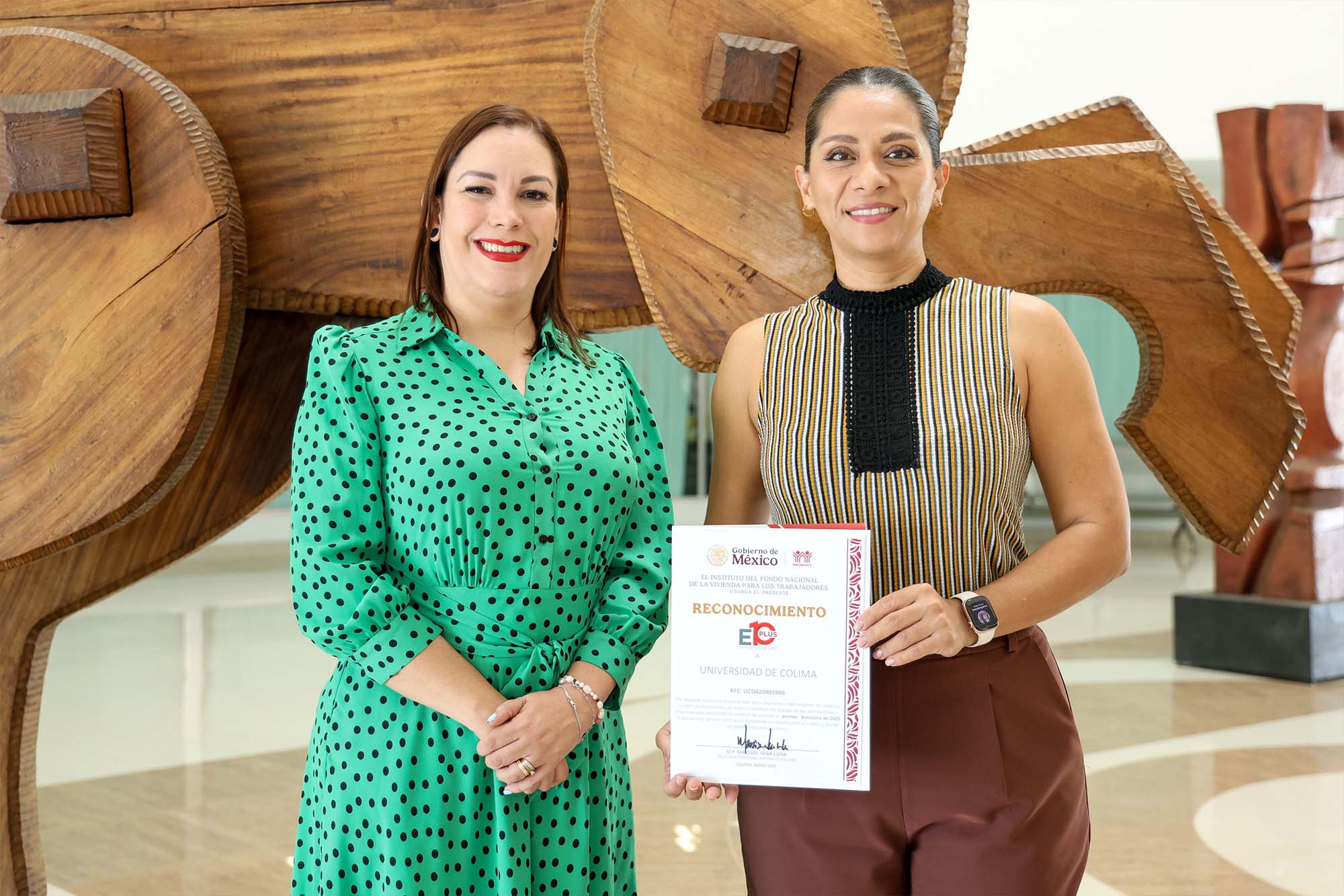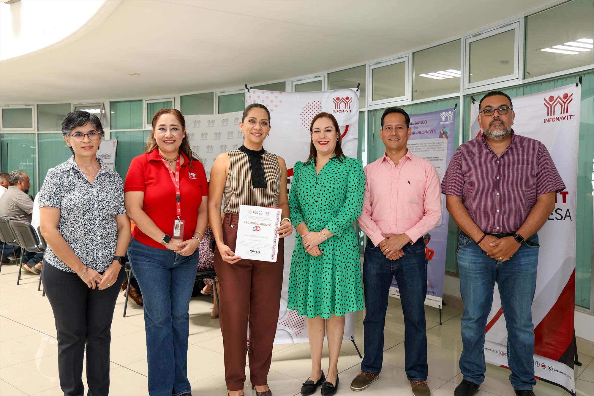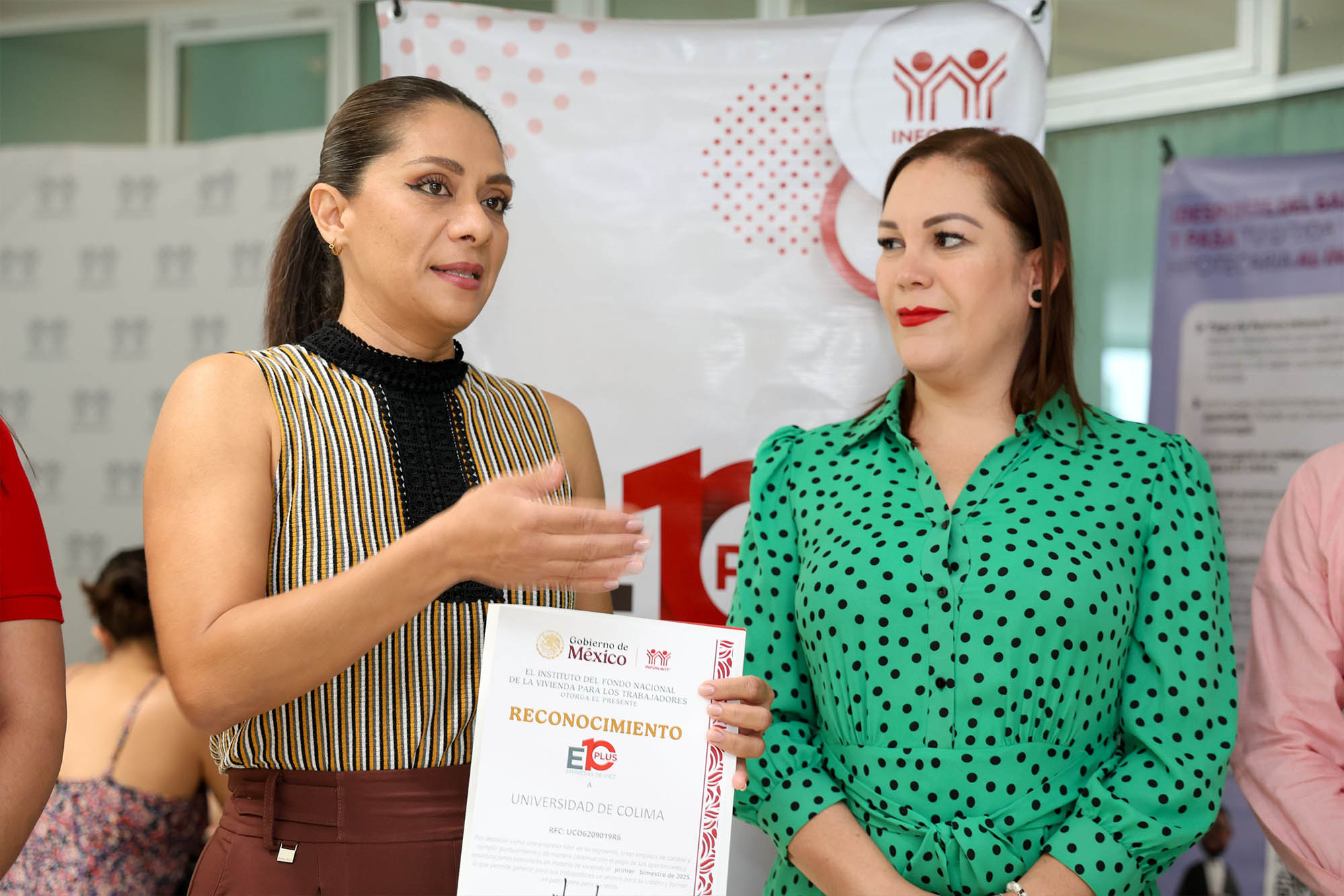 Marisol Vega Luna se congratuló de poder entregar una vez más este reconocimiento a la Universidad de Colima como Empresa de Diez Plus. “El reconocimiento es para todas aquellas empresas que son grandes empleadores, que tienen empleos de calidad y que se preocupan por su gente y por tener el beneficio social, como es el Infonavit y el Seguro Social”.