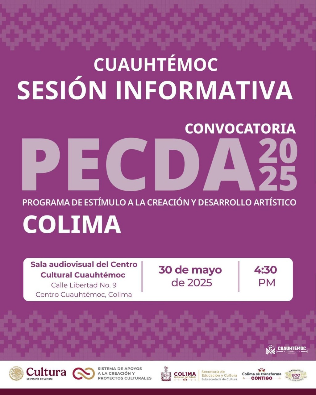 La Subsecretaría de Cultura del Gobierno del Estado de Colima continúa realizando sesiones informativas gratuitas para todas las personas interesadas en participar en la convocatoria 2025 del Programa de Estímulos a la Creación y Desarrollo Artístico (PECDA), con financiamiento de la Secretaría de Cultura del Gobierno de México, a través del Sistema de Apoyos a la Creación y Proyectos Culturales, en coordinación con la dependencia estatal de Cultura.