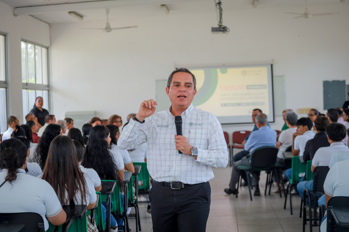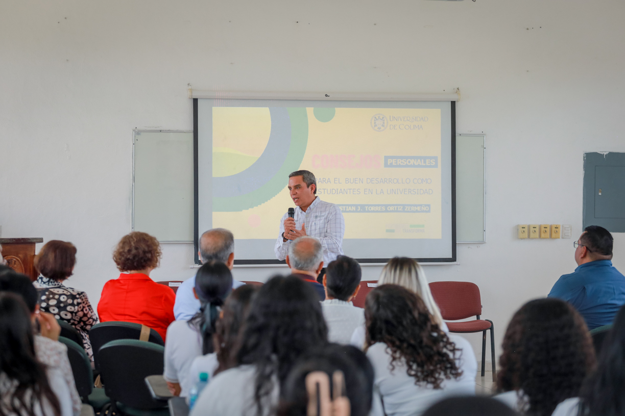 *En su charla, el rector Christian Torres Ortiz compartió una serie de reflexiones centradas en el desarrollo personal como base para una vida universitaria plena. También entregaron un reconocimiento a la primera secretaria del plantel, María Gertrudis Íñiguez.