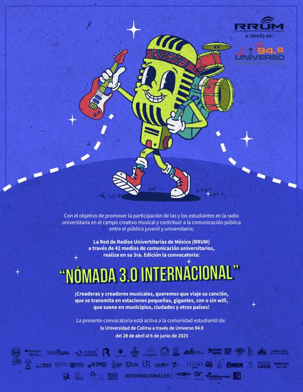Universo 94.9, en coordinación con la Red de Radios Universitarias de México (RRUM), invita a las y los estudiantes de la Universidad de Colima a participar en la convocatoria Nómada 3.0 Internacional, un concurso musical que busca impulsar el talento universitario emergente y fortalecer la comunicación pública entre audiencias jóvenes y académicas.