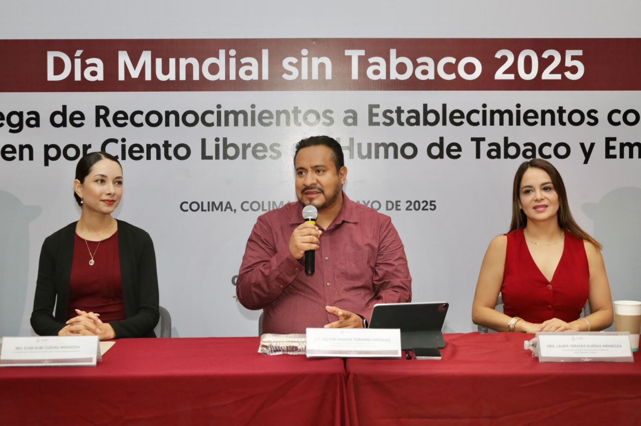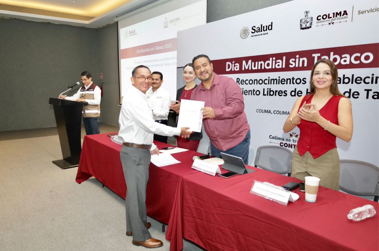 En la entrega simbólica de reconocimientos a 5 de 46 establecimientos que recibieron la certificación como Espacios 100 % Libres de Humo de Tabaco y Emisiones en el marco de la conmemoración del próximo Día Mundial Sin Tabaco, el secretario de Salud, Víctor Manuel Torrero Enríquez, dijo que Colima asume el llamado de la Organización Mundial de la Salud de enfocar su acción en la protección de jóvenes contra las estrategias de la industria tabacalera, ya que el tabaquismo no es un simple hábito, sino una epidemia en salud pública que impacta en la vida de cada colimense y en la sostenibilidad del Sistema de Salud.