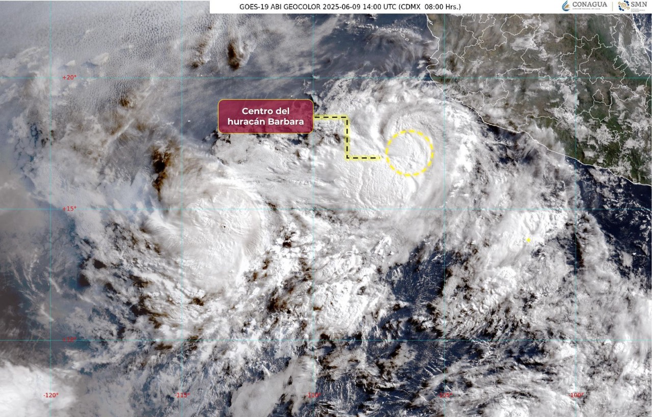 ‘Bárbara’ es el primer huracán en el Pacífico mexicano en esta temporada y presenta vientos máximos sostenidos de 120 kilómetros por hora, rachas de 150 kilómetros por hora y desplazamiento hacia el noroeste a 17 kilómetros por hora.