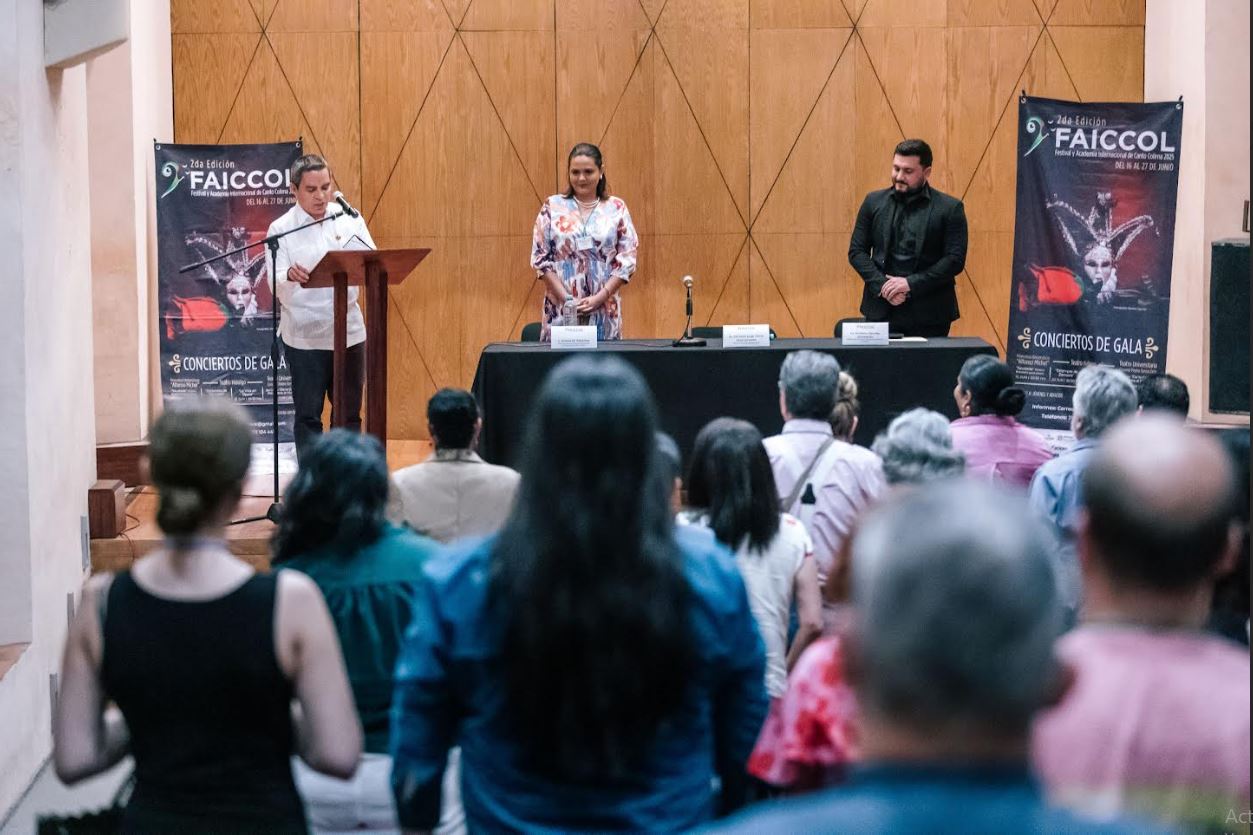 La tarde de este lunes 16 de junio, en el Museo del Palacio, se inauguró oficialmente la segunda edición del Festival y Academia Internacional de Canto Colima (FAICCOL 2025), un espacio que impulsa el desarrollo integral de cantantes líricos a través de clases magistrales, asesorías escénicas, conferencias especializadas y presentaciones artísticas con proyección internacional.