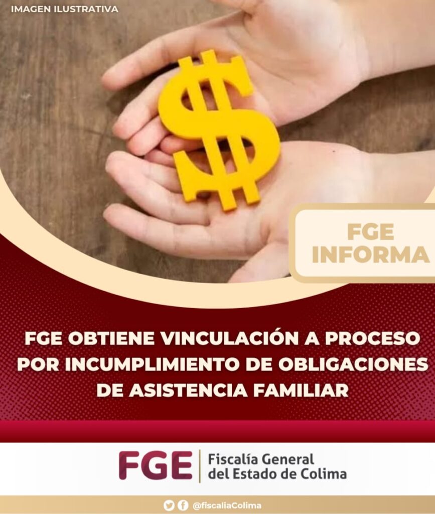 La Fiscalía General del Estado (FGE), obtuvo la vinculación a proceso en contra de José Antonio “N”, como presunto responsable del hecho que la ley señala como delito de incumplimiento de las obligaciones de asistencia familiar, cometido en agravio de su menor hijo, en hechos ocurridos en la ciudad de Colima; el Juez de control otorgó un mes de investigación complementaria.