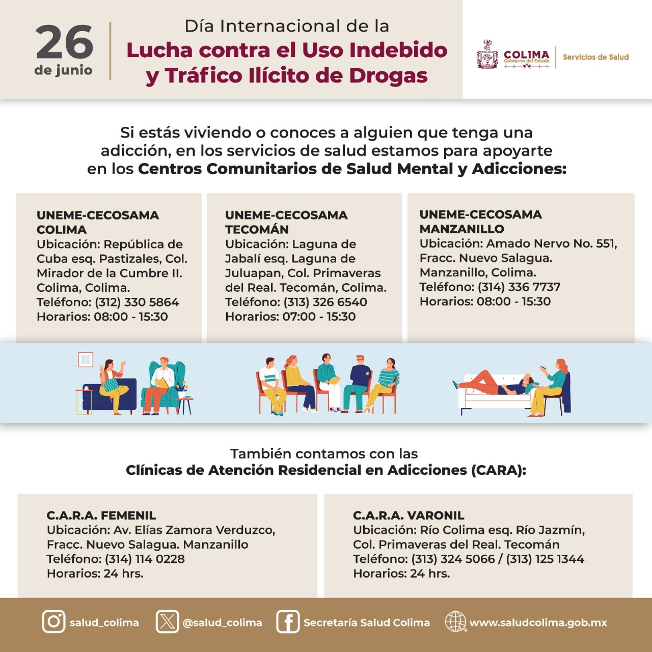 La Secretaría de Salud del Gobierno del Estado de Colima brinda atención gratuita a personas que consumen sustancias adictivas en las Clínicas de Atención Residencial en Adicciones (CARA), varonil en Tecomán) y femenil en Manzanillo, donde otorga apoyo integral basado en acciones profesionales de tratamiento terapéutico, revisión clínica, orientación, información y ayuda mutua para su recuperación personal.
