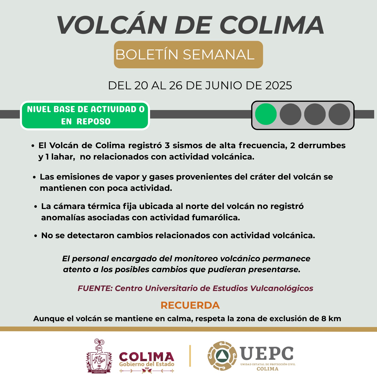 La Unidad Estatal de Protección Civil (UEPC) del Gobierno del Estado de Colima informa que, durante la semana del 20 al 26 de junio, el Volcán de Colima registró tres sismos de alta frecuencia, dos derrumbes y un lahar, sin que esta actividad represente cambios en el comportamiento del coloso, pues permanece en ‘semáforo verde’.