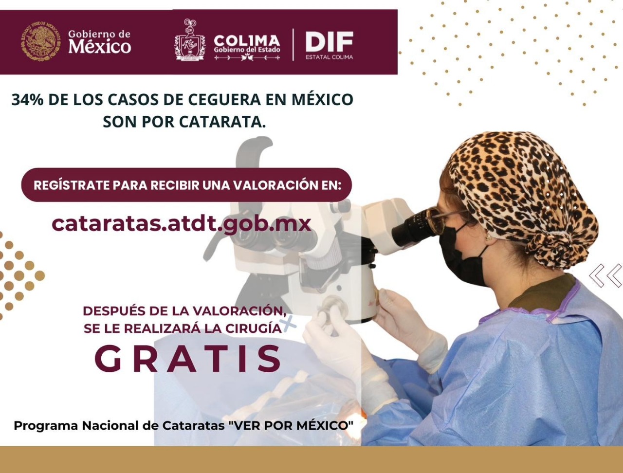 Como parte del trabajo coordinado entre el Gobierno del Estado de Colima, a través del DIF Estatal, y el Gobierno de México, se encuentra abierta la convocatoria para formar parte de la Estrategia Nacional de Cirugía de Catarata ‘Ver por México’, que ofrece valoraciones visuales y cirugías gratuitas para quienes lo requieran.
