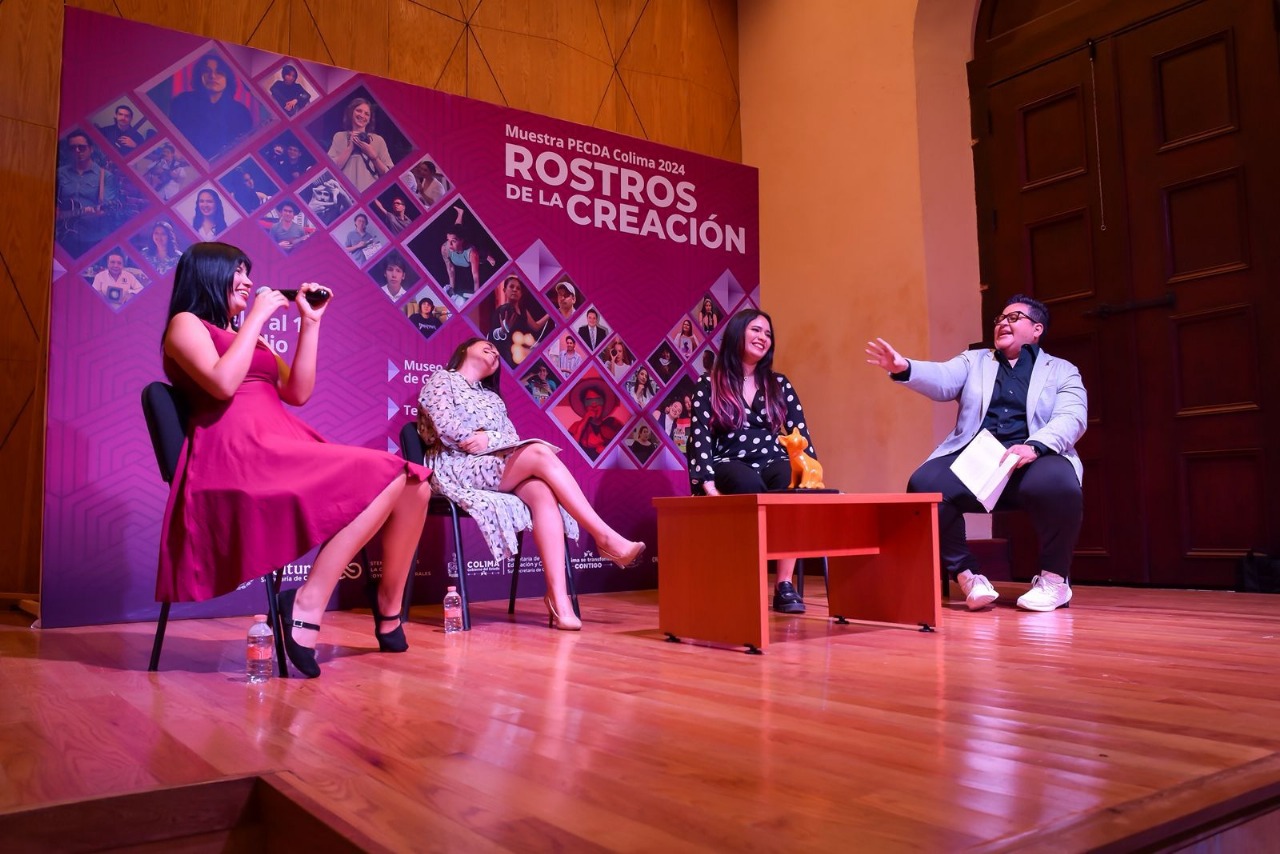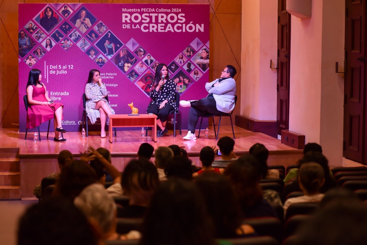 Continuando con la Muestra PECDA Colima 2024: Rostros de la Creación, organizada por la Subsecretaría de Cultura del Gobierno del Estado de Colima, en el auditorio ‘María del Refugio Morales’ del Museo Palacio de Gobierno se efectuó el primer conversatorio ‘Procesos Creativos’, moderado por la escritora Zeydel Bernal, donde participaron las beneficiarias del Programa de Estímulos a la Creación y Desarrollo Artístico (emisión Colima 2024), Norma Sugey Navarro Martínez, Claudia Excaret Santos Campuzano y Mariana Soto Almaguer, quienes dialogaron ampliamente sobre sus proyectos literarios.